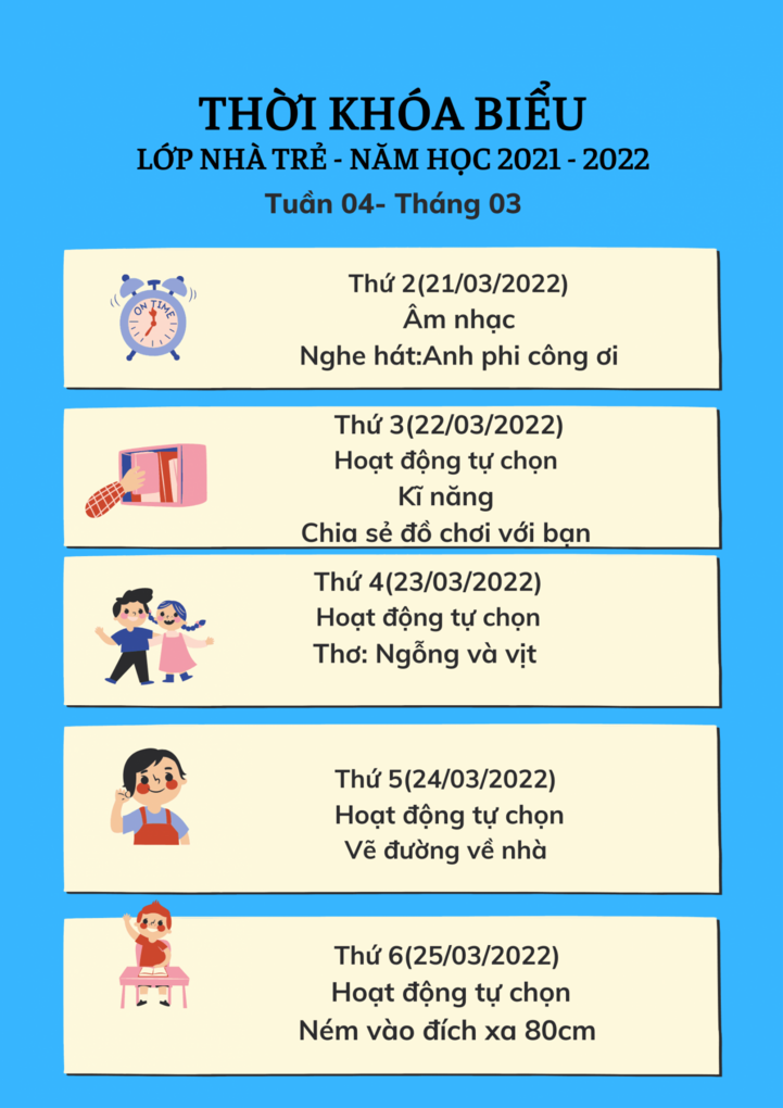 Trường Mẫu giáo Chim Non xây dựng kế hoạch hoạt động kết nối với gia đình, trẻ em trong thời gian tạm dừng đến trường do dịch Covid 19 thời gian tuần 04 tháng 03/2022 (Từ 21/03 - 25/03). Rất mong nhận được sự hợp tác của quý phụ huynh trong các hoạt động vui chơi tại nhà của con trong thời gian tạm dừng đến trường.