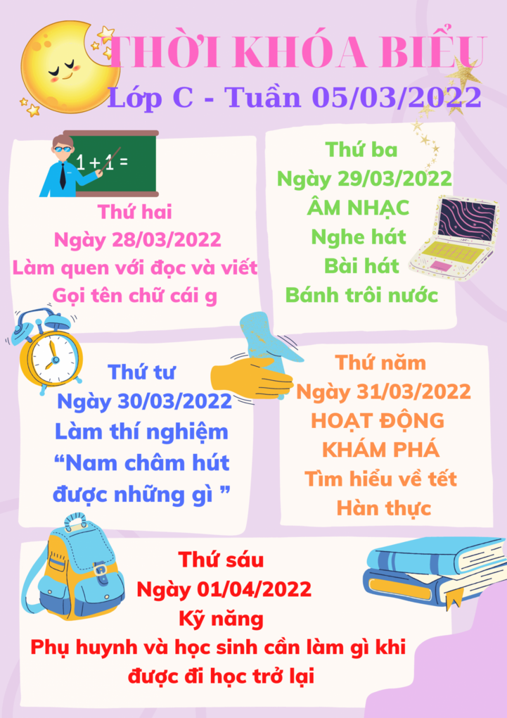 Trường Mẫu giáo Chim Non xây dựng kế hoạch hoạt động kết nối với gia đình, trẻ em trong thời gian tạm dừng đến trường do dịch Covid 19 thời gian tuần 05 tháng 03/2022 (Từ 28/03 - 01/04). Rất mong nhận được sự hợp tác của quý phụ huynh trong các hoạt động vui chơi tại nhà của con trong thời gian tạm dừng đến trường.