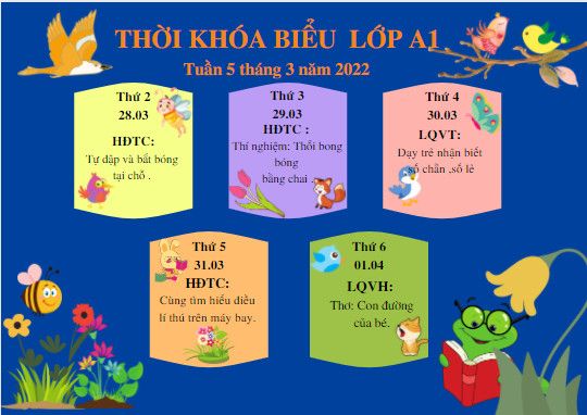 Trường Mẫu giáo Chim Non xây dựng kế hoạch hoạt động kết nối với gia đình, trẻ em trong thời gian tạm dừng đến trường do dịch Covid 19 thời gian tuần 05 tháng 03/2022 (Từ 28/03 - 01/04). Rất mong nhận được sự hợp tác của quý phụ huynh trong các hoạt động vui chơi tại nhà của con trong thời gian tạm dừng đến trường.