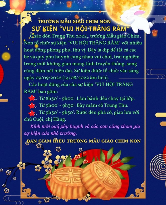 Chào đón Trung Thu 2022, trường Mẫu giáo Chim Non tổ chức sự kiện "VUI HỘI TRĂNG RẰM" với nhiều hoạt động phong phú, thú vị. Đây là dịp để tất cả các bé và quý phụ huynh cùng nhau vui chơi, trải nghiệm trong một không gian mang tính truyền thống, song cũng đậm nét hiện đại. Sự kiện được tổ chức vào sáng ngày 09/09/2022 (14/08/2022 âm lịch).