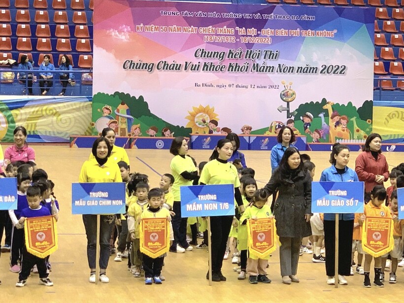 Sáng nay, 07/12/2022, Kỷ niệm 50 năm chiến thắng " Hà Nội- Điện Biên Phủ trên không", Trung tâm văn hóa thông tin và thể thao Ba Đình đã kết hợp với Phòng giáo dục đào tạo Quận tổ chức Hội thi " Chúng cháu vui khỏe " dành cho trẻ lứa tuổi mầm non các trường trên địa bàn Quận.
