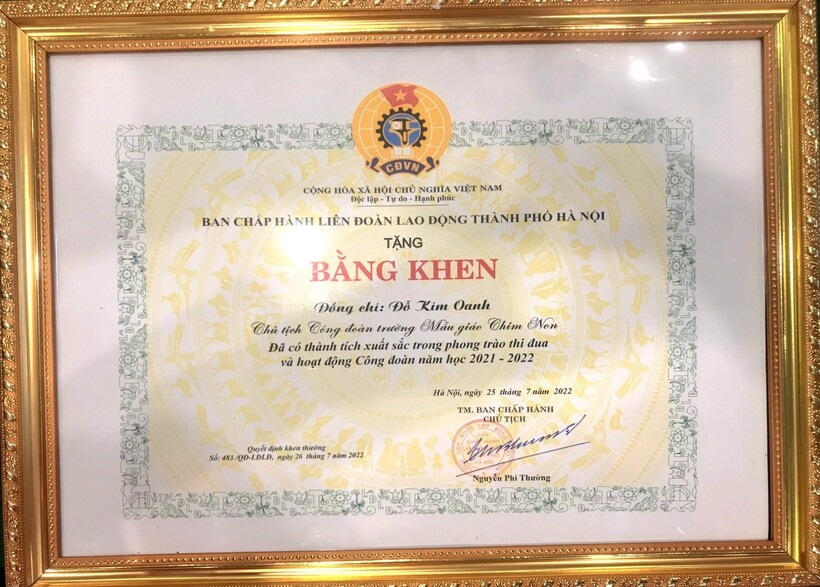 Ngày 21/10/2022, tại Hội nghị Tổng kết hoạt động Công đoàn và sơ kết chương trình phối hợp công tác giữa Liên đoàn Lao động với phòng Giáo dục & Đào tạo quận năm học 2021 – 2022; Triển khai nhiệm vụ năm học 2022 - 2023, đồng chí Đỗ Kim Oanh chủ tịch Công đoàn trường Mẫu giáo Chim Non đã vinh dự được Liên đoàn Lao động thành phố Hà Nội tặng Bằng khen vì có thành tích xuất sắc trong phong trào thi đua và hoạt động Công đoàn năm học 2021 – 2022