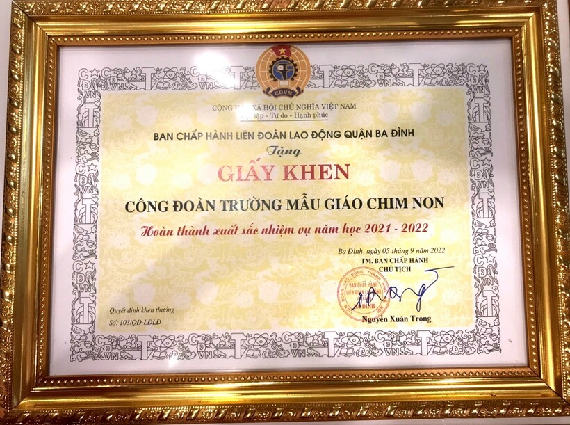 Từ những đóng góp đó, ngày 21/10/2022, tại Hội nghị Tổng kết hoạt động Công đoàn và sơ kết chương trình phối hợp công tác giữa Liên đoàn Lao động với phòng Giáo dục & Đào tạo quận năm học 2021 – 2022; Triển khai nhiệm vụ năm học 2022 - 2023, đồng chí Đỗ Kim Oanh chủ tịch Công đoàn trường Mẫu giáo Chim Non đã vinh dự được Liên đoàn Lao động thành phố Hà Nội tặng Bằng khen vì có thành tích xuất sắc trong phong trào thi đua và hoạt động Công đoàn năm học 2021 – 2022. Công đoàn nhà trường cũng nhận giấy khen Hoàn thành xuất sắc nhiệm vụ của Liên đoàn lao động Quận Ba Đình.