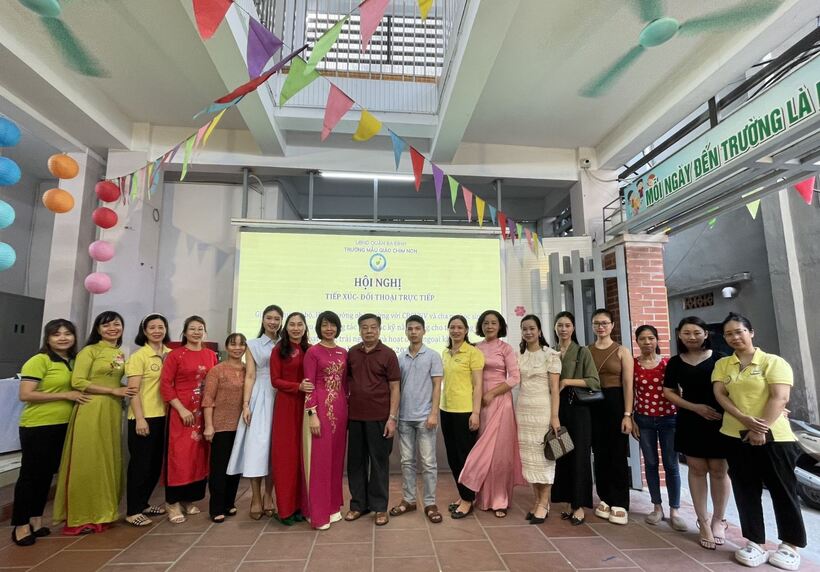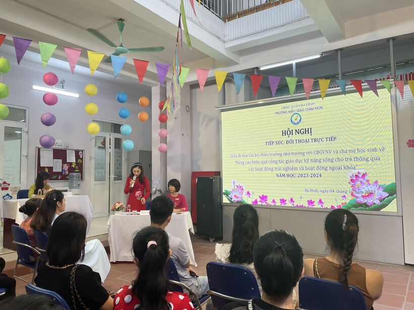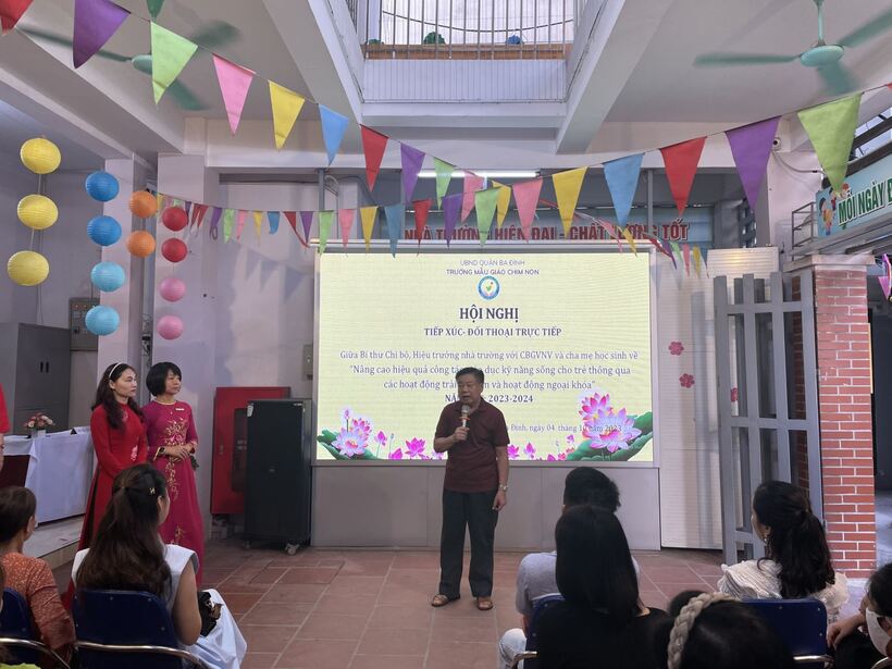 Thực hiện kế hoạch của UBND quận Ba Đình, sáng ngày 04/10/2023 , trường Mẫu giáo Chim Non tổ chức Hội nghị tiếp xúc, đối thoại trực tiếp giữa Bí thư Chi bộ - Hiệu trưởng nhà trường với đội ngũ cán bộ quản lý, giáo viên, nhân viên và cha mẹ học sinh. Hội nghị nhằm nắm bắt tâm tư, nguyện vọng của giáo viên, nhân viên, phụ huynh học sinh từ đó giúp nhà trường có sự điều chỉnh về việc "Tổ chức hoạt động trải nghiệm, giáo dục kỹ năng sống, hoạt động ngoại khóa cho trẻ tại trường Mẫu giáo Chim Non "