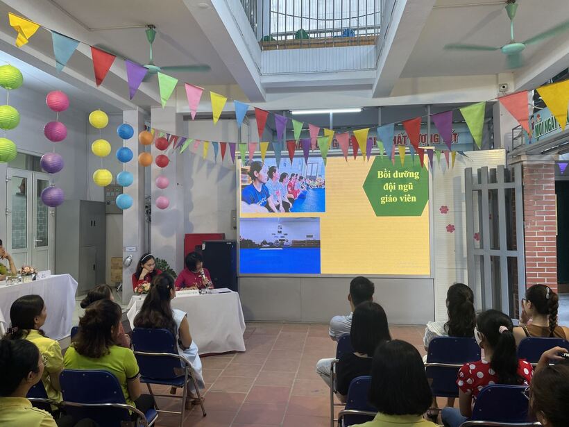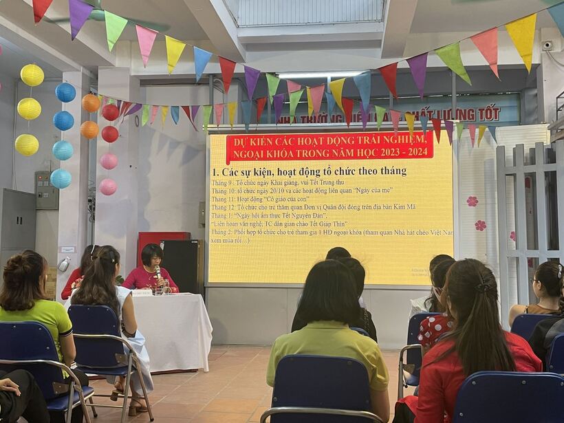 Tại hội nghị đối thoại của nhà trường, cô giáo Lê Bảo Ngọc - Bí thư Chi bộ, Hiệu trưởng nhà trường đã nhấn mạnh và nêu rõ năm học 2023 – 2024 được xác định là một năm học có nhiều khó khăn thách thức với nhà trường về mục tiêu, quan điểm, các hoạt động giáo dục của nhà trường về đổi mới công tác quản lí, chỉ đạo nhằm mục đích nâng cao chất lượng dạy học, chất lượng tổ chức giáo dục kỹ năng sống thông qua hoạt động trải nghiệm và ngoại khóa cho trẻ khi diện tích nhà trường rất nhỏ hẹp. Nhà trường rất cần sự phối hợp với Cha mẹ trẻ trong mọi hoạt động của lớp, của nhà trường, để tổ chức cho trẻ trải nghiệm hiệu quả. Tăng cường cho trẻ trải nghiệm theo các chủ đề trong năm và dịp ngày hội ngày lễ, các hoạt động ngoại khóa của các con. Các nội dung nhận được sự ủng hộ đồng thuận của toàn thể phụ huynh tham gia hội nghị.