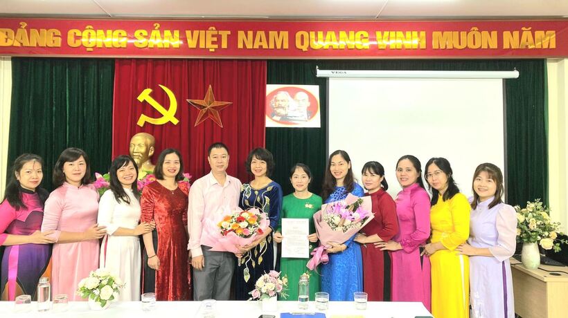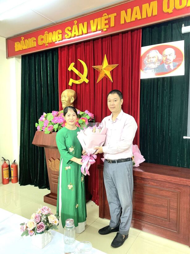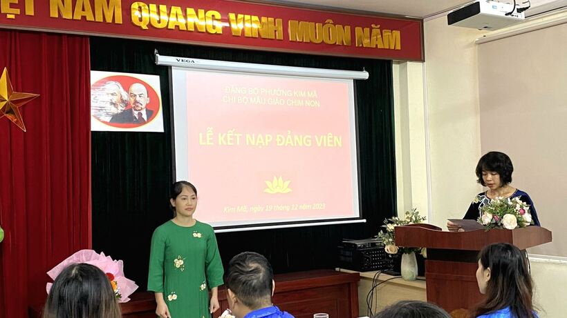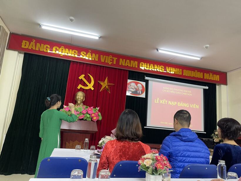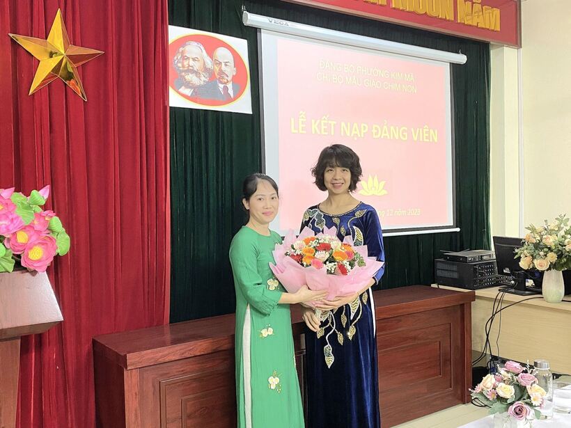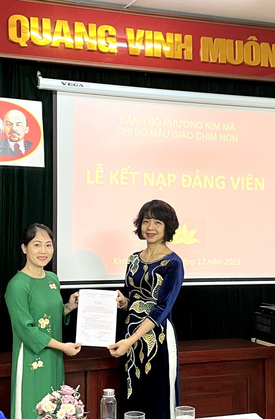 Đồng chí Lê Bảo Ngọc - Bí thư Chi bộ, Hiệu trưởng nhà trường đã trao quyết định kết nạp Đảng và tặng hoa chúc mừng đồng chí đảng viên mới Đinh Thị Bích Loan. Đồng chí giao nhiệm vụ cho đồng chí Phó Bí thư chi bộ Đỗ Thị Hương Giang, đồng chí Đỗ Kim Oanh tiếp tục theo dõi, giúp đỡ đồng chí đảng viên mới để đồng chí hoàn thành tốt nhiệm vụ của người đảng viên.