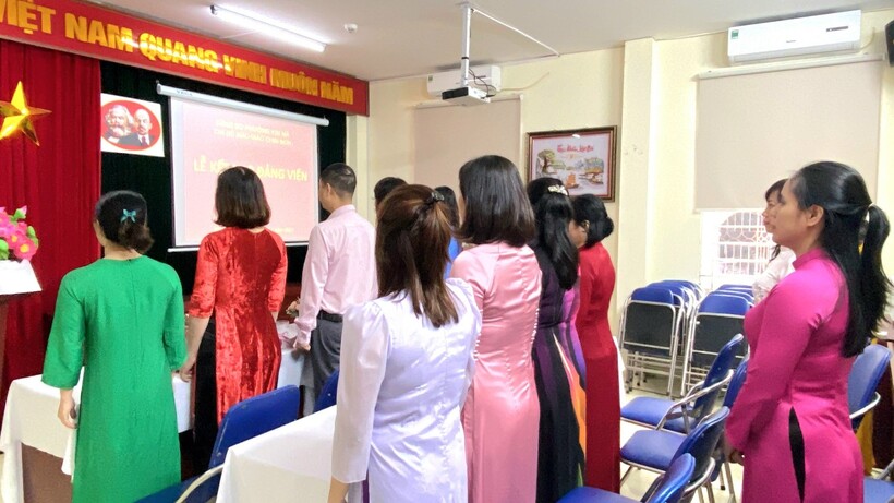 Dưới cờ Tổ Quốc và chân dung Chủ tịch Hồ Chí Minh vĩ đại, đồng chí đảng viên mới đã thực hiện nghi thức tuyên thệ thể hiện quyết tâm thực hiện tốt Điều lệ Đảng, kiên định với đường lối, lí tưởng của Đảng và phấn đấu, rèn luyện, trau dồi phẩm chất, năng lực để trở thành người đảng viên gương mẫu, góp phần xây dựng chi bộ ngày càng vững mạnh, nhà trường ngày càng phát triển