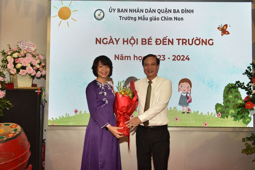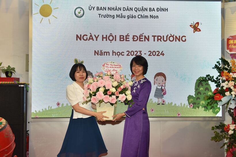 Đại diện lãnh đạo Đảng ủy, UBND Phường Kim Mã tặng hoa Nhà trường