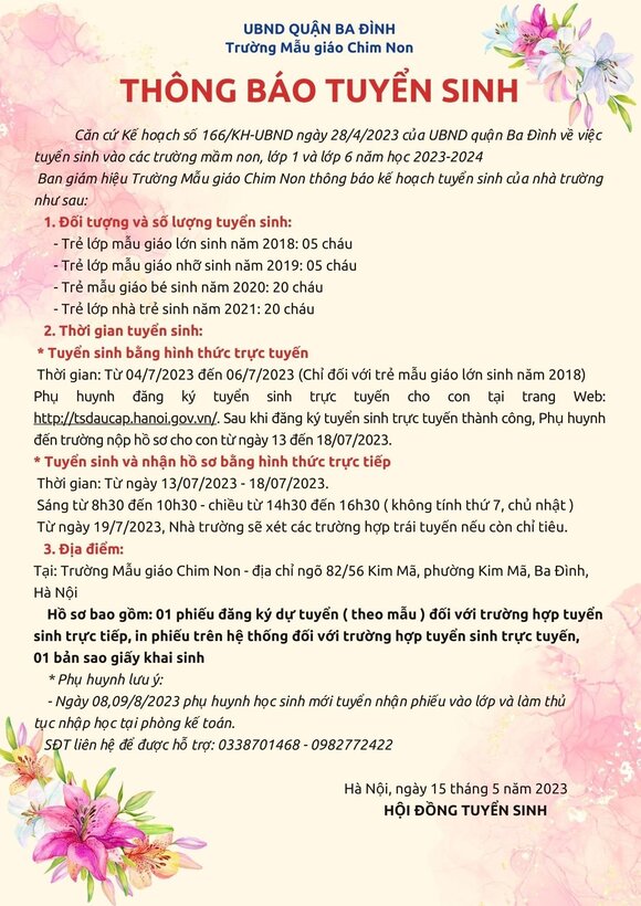 | Căn cứ vào tình hình cơ sở vật chất, nhân lực và đặc điểm thực tế của nhà trường, trường Mẫu giáo Chim Non xin thông báo tới toàn thể nhân dân phường Kim Mã, các quý vị phụ huynh có con trong độ tuổi đi học mẫu giáo về kế hoạch tuyển sinh của nhà trường năm học 2023 – 2024 như sau: I. ĐỐI TƯỢNG VÀ ĐỊA BÀN TUYỂN SINH: 1. Đối tượng tuyển sinh: Các cháu MG lớn sinh năm 2018 (Phổ cập), MG nhỡ sinh năm 2019, MG bé sinh năm 2020, nhà trẻ sinh năm 2021. 2. Địa bàn tuyển sinh: Các cháu có hộ khẩu hoặc đang cư trú trên địa bàn phường Kim Mã - BĐ – HN. II. CHỈ TIÊU TUYỂN SINH: 50 cháu. (Trong đó: MG lớn: 5 cháu, MG nhỡ: 5 cháu, MG bé: 20 cháu, nhà trẻ: 20 cháu) III. THỜI GIAN VÀ PHƯƠNG THỨC TUYỂN SINH: 1. Tuyển sinh bằng hình thức trực tuyến * Thời gian: Từ 04/7/2023 đến 06/7/2023 (Chỉ đối với trẻ mẫu giáo lớn sinh năm 2018) Phụ huynh đăng ký tuyển sinh trực tuyến cho con tại trang Web: http://tsdaucap.hanoi.gov.vn/ . Sau khi đăng ký tuyển sinh trực tuyến thành công, Phụ huynh đến trường nộp hồ sơ cho con từ ngày 13 đến 18/7/2023. 2. Tuyển sinh và nhận hồ sơ bằng hình thức trực tiếp * Thời gian: Từ Ngày 13/7/2023 đến ngày 18/7/2023; Sáng từ 8h30 đến 10h30 – chiều từ 14h30 đến 16h30 (không tính thứ 7 và chủ nhật) * Địa điểm: Tại trường Mẫu giáo Chim Non – địa chỉ ngõ 82/56 Kim Mã, phường Kim Mã, Ba Đình, Hà Nội |