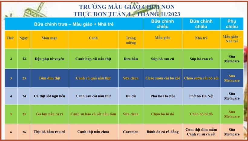 Thực đơn cho bé yêu (tuần 4 tháng 11) - trường MG Chim Non