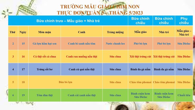 Trường Mẫu giáo Chim Non kính gửi Qúy Phụ huynh thực đơn tuần 3 tháng 5 (Từ ngày 15/5-19/5/2023)