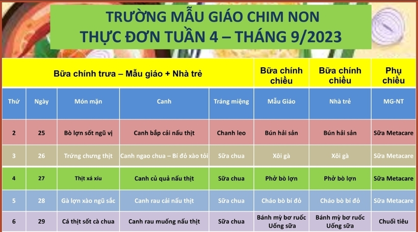 Trường Mẫu giáo Chim Non kính gửi Quý phụ huynh Thực đơn của các bé tuần 4 tháng 9/2023. Các bác cấp dưỡng luôn luôn nghiên cứu, thay đổi thực đơn theo tuần để đem đến cho bé những bữa ăn ngon, trang trí đẹp, đủ định lượng và đúng tỉ lệ các chất dinh dưỡng.