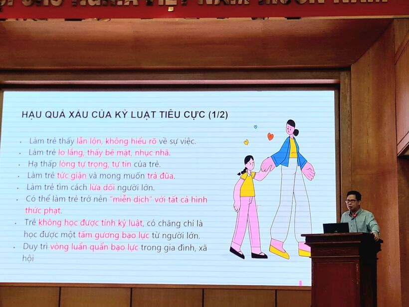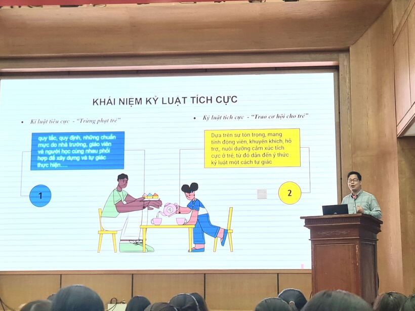 Giáo sư đã trao đổi 1 số nội chính của chuyên đề như: khái niệm, nguyên tắc, kỹ năng, quy trình... qua đó giúp các học viên nhận thức lại bởi những đòn roi trừng phạt về thể chất và tinh thần thời thơ ấu sẽ để lại những dấu ấn nặng nề trong tâm trí của trẻ và ảnh hưởng tiêu cực đến quá trình hình thành, phát triển nhân cách con người. Để trẻ lớn lên trong hạnh phúc, người GV mầm non cần hiểu và sử dụng hiệu quả hình thức “kỷ luật tích cực”. Kỷ luật tích cực dạy trẻ biết hành vi nào được phép, hành vi nào là không được phép và lý do tại sao? Qua đó giúp trẻ nhận ra hành vi sai trái của mình và có ý thức trách nhiệm sửa lỗi. Kỷ luật tích cực gây dựng mối quan hệ tôn trọng giữa GV và trẻ; gián tiếp dạy trẻ những cách cư xử lịch sự nhã nhặn, không bạo lực, có sự tôn trọng bản thân, biết cảm thông và tôn trọng quyền của người khác. Động viên khuyến khích trẻ thực hiện những hành vi đúng đắn phù hợp với chuẩn mực đạo đức, xây dựng ở trẻ sự tự tin và lòng tự trọng.