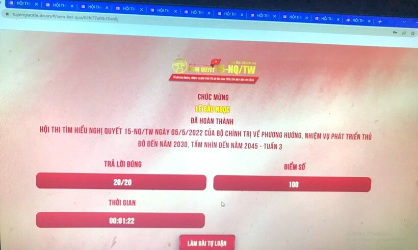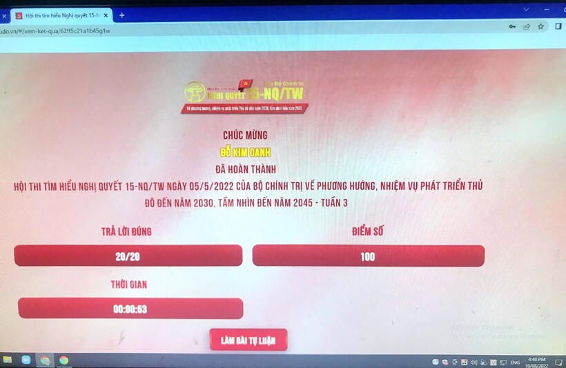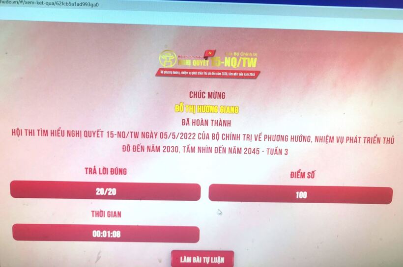 100% cán bộ giáo viên nhân viên nhà trường đã tham gia Cuộc thi tìm hiểu Nghị quyết 15-NQ/TW của Bộ Chính trị. Trong 3 tuần đầu, CBGVNV đã tham gia với con số ấn tượng 167 lượt thi. Số lượng CBGVNV đạt 20/20 điểm thi trắc nghiệm là 100%. Đặc biệt có đ/c Đỗ Kim Oanh đạt nhiều lượt 20/20 điểm với thời gian chưa đến 01 phút.