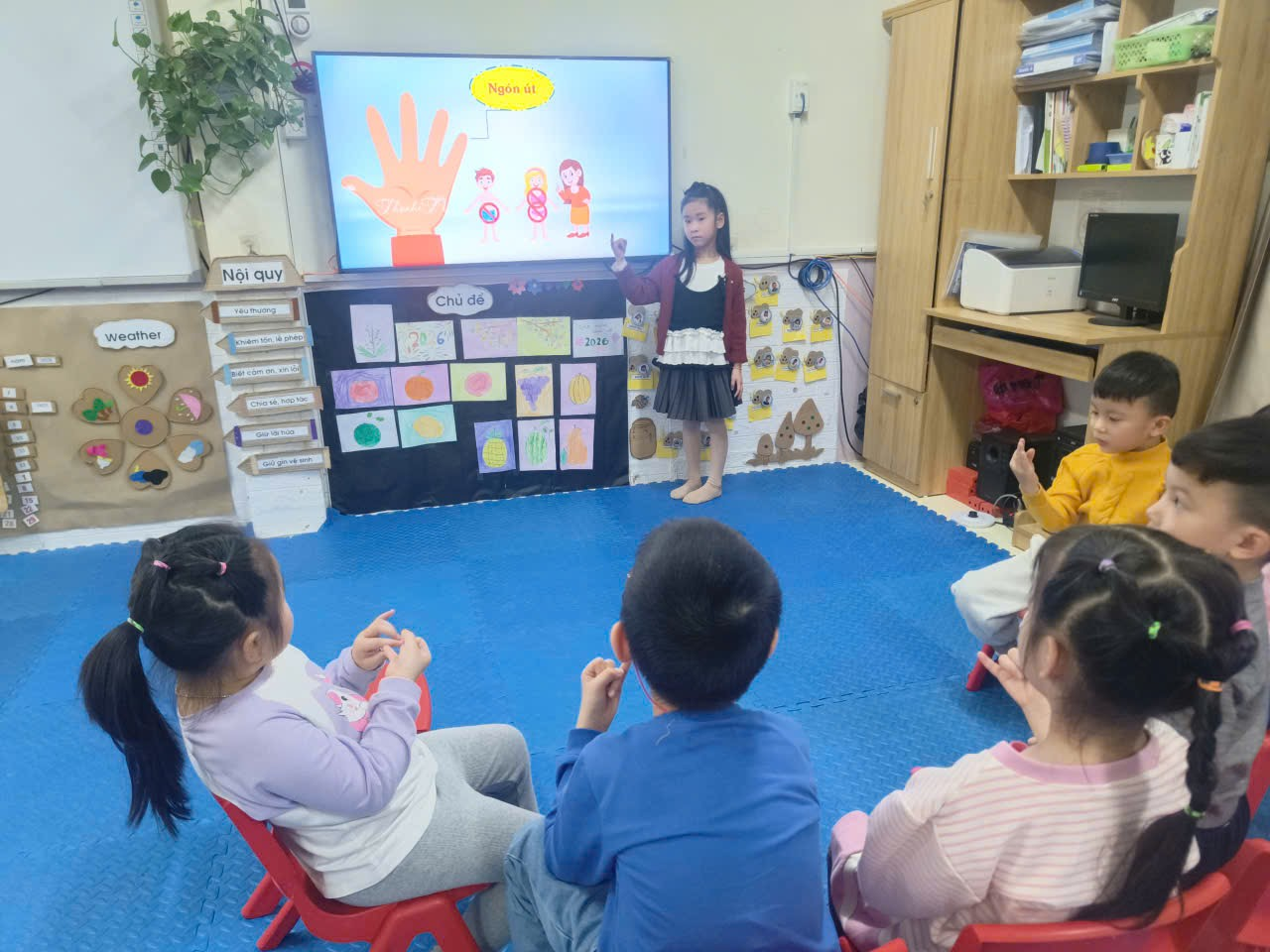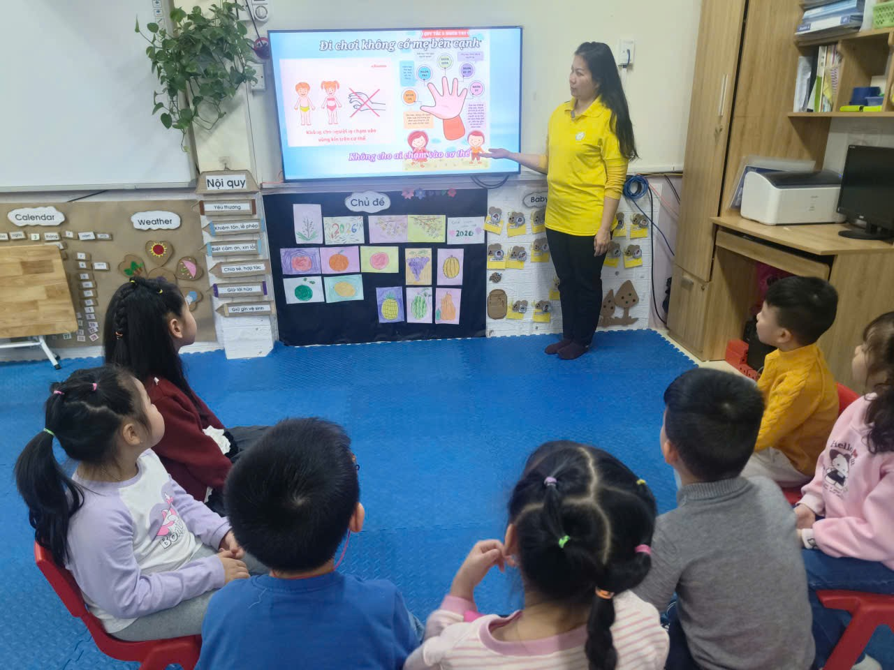 Tại lớp Mẫu giáo lớn A2 trường Mẫu giáo Chim Non, 'Quy tắc 5 ngón tay' được ví như lá chắn thần kỳ giúp trẻ tự bảo vệ bản thân trước nguy cơ bị xâm hại. Các cô giáo hướng dẫn trẻ xác định ranh giới tiếp xúc phù hợp qua từng ngón tay xinh: Ngón cái (gần nhất) dành cho những cái ôm hôn của ông bà, bố mẹ; Ngón trỏ để nắm tay thầy cô, bạn bè; Ngón giữa chỉ bắt tay người quen; Ngón áp út vẫy tay chào người lạ và Ngón út (xa nhất) là tín hiệu báo động nhắc trẻ phải xua tay, bỏ chạy và hét lớn khi có người cố tình đụng chạm xấu. Bài học này không chỉ giúp trẻ hiểu về giới hạn thân thể mà còn rèn luyện sự dũng cảm để nói 'KHÔNG' dứt khoát với những hành vi không an toàn."