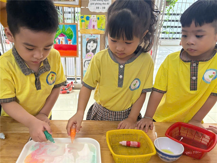Với những nguyên liệu chính như: Sữa; Nước rửa bát; Màu thực phẩm; Tăm bông... Các bạn nhỏ lớp mẫu giáo nhỡ B1 đã có một thí nghiệm thú vị về sự bùng nổ màu sắc trên đĩa. Bí mật của sự bùng nổ màu sắc nằm ở tính chất hóa học: Trong sữa có nước và chất béo lơ lửng bên trong. Khi nước rửa bát tiếp xúc với sữa sẽ nhanh chóng chạy đi bắt giữ các phân tử chất béo. Sự “đuổi bắt” này làm màu sắc chạy khắp đĩa. Thật kì diệu phải không các bạn!