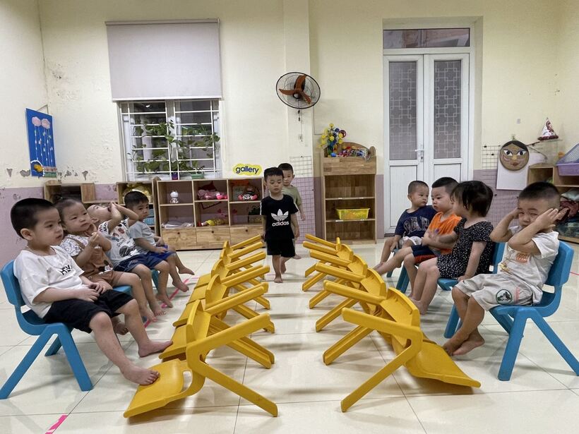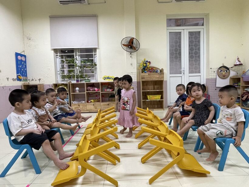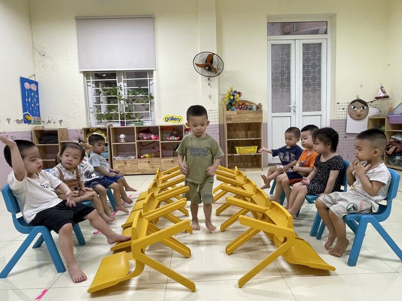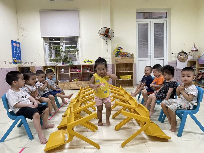 Các bé đã giúp cô bê ghế, cùng xếp hàng tham gia bài tập đi trong đường hẹp tương đối khó. Dưới sự hướng dẫn của các cô, bé đã thành công khi đi không chạm 2 hàng ghế ở bên tiến về đích thành công.