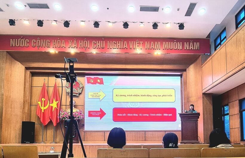 Buổi chiều, lớp học vinh dự được bà Phạm Thị Diễm - phó chủ tịch UBND Quận Ba Đình trao đổi về chuyên đề "Đạo đức nhà giáo và xây dựng trường học hạnh phúc". Tiếp theo chương trình là việc triển khai nhiệm vụ năm học 2023-2024 của đ/c Lê Đức Thuận - Trưởng Phòng GDĐT Quận Ba Đình
