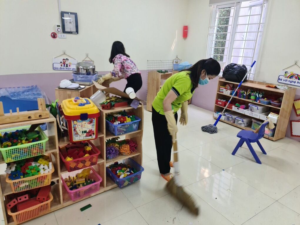 Các công việc được các cô bác trường MG Chim Non thực hiện nhanh chóng đúng quy định của công tác phòng chống dịch.