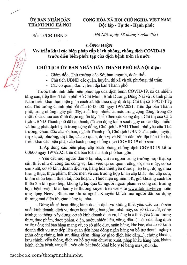 Công văn hỏa tốc số 15/CĐ-UBND Thành phố Hà Nội về việc triển khai các biện pháp cấp bách phòng, chống dịch COVID-19 trước diễn biến phức tạp của dịch bệnh trên cả nước