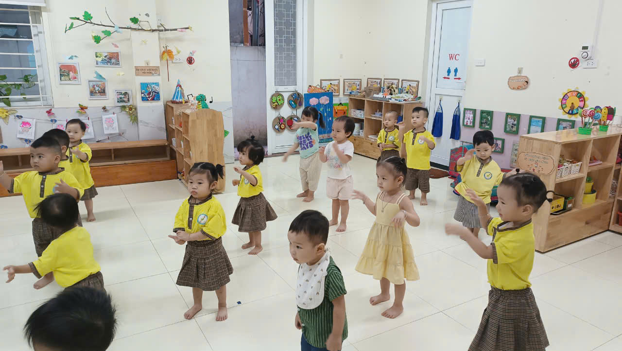 Các bé lớp Nhà trẻ D tuy bé nhất trường nhưng vẫn tập thể dục đều đặn hàng ngày và rất hứng thú với hoạt động này.