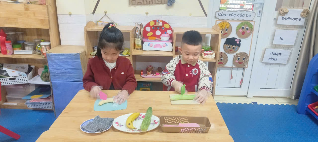 *Công cụ phù hợp: Bắt đầu với kéo nhựa an toàn (chỉ cắt giấy, không cắt tay) và dao nhựa răng cưa (cắt được củ quả mềm nhưng không đứt tay).