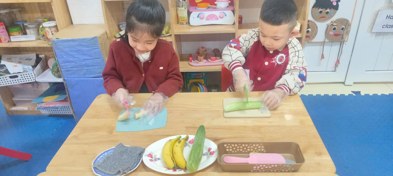 * Với dao: Bắt đầu bằng dao nhựa răng cưa cắt chuối/dâu tây -> Cắt dưa chuột/đậu phụ -> Phết bơ/mứt lên bánh mì.