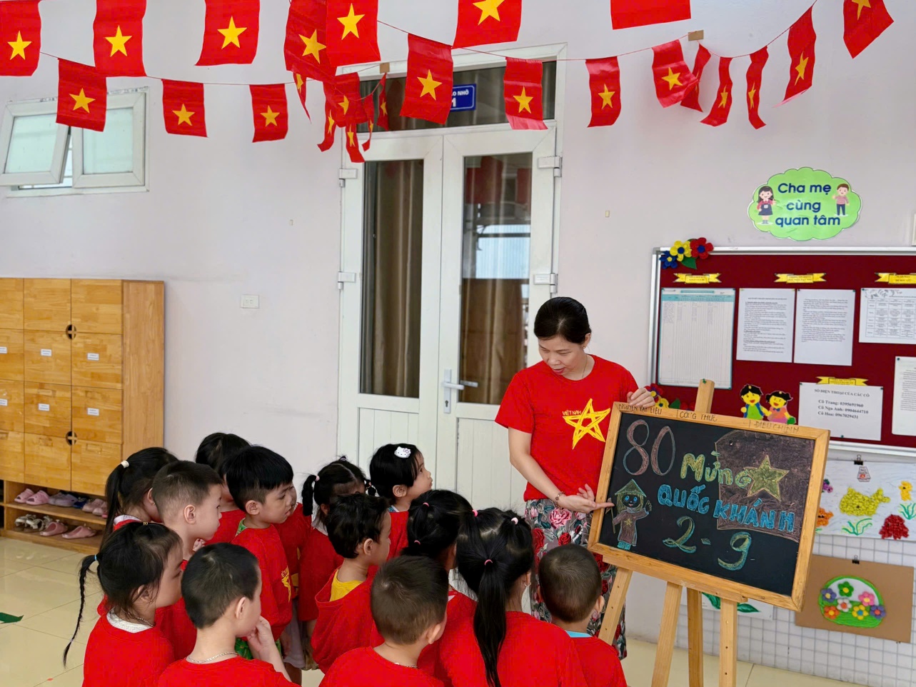 Các cô giáo cũng lồng ghép vào giờ học những câu chuyện lịch sử giản dị, phù hợp lứa tuổi, giúp các con hiểu thêm ý nghĩa của ngày 2/9 – ngày mà dân tộc ta giành được độc lập, tự do.