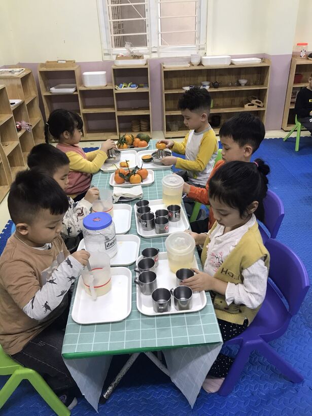Hoạt động "vắt nước cam" khiến các bé rất thích thú vì các bé được thưởng thức cốc nước cam ngon, ngọt do chính mình tự tay pha làm. Các bé còn hiểu được muốn cơ thể khoẻ mạnh và lớn lên cần phải ăn uống đủ chất và cần uống bổ sung các loại nước hoa quả chứa nhiều vitamin. Đặc biệt nước cam có tác dụng giải khát và bồi bổ thể lực vì có nhiều vitamin C. Các bé được cô giáo hướng dẫn cụ thể từng kỹ năng cầm, xoay để vắt cam sao cho ra hết nước trong miếng cam và cùng thưởng thức cốc nước cam thơm ngon bổ dưỡng.
