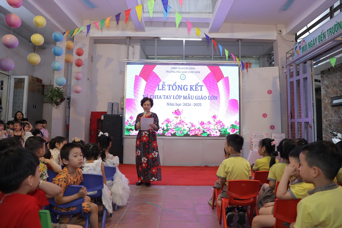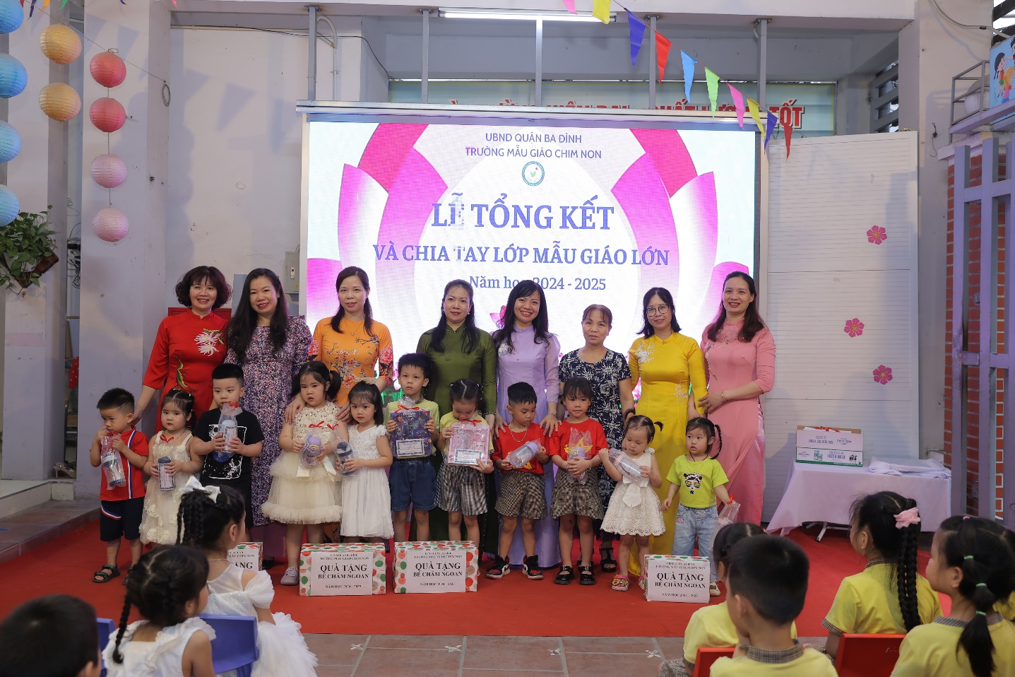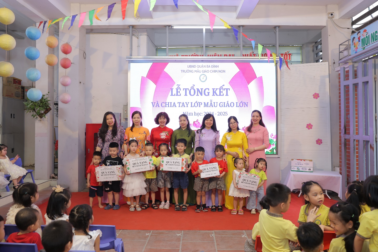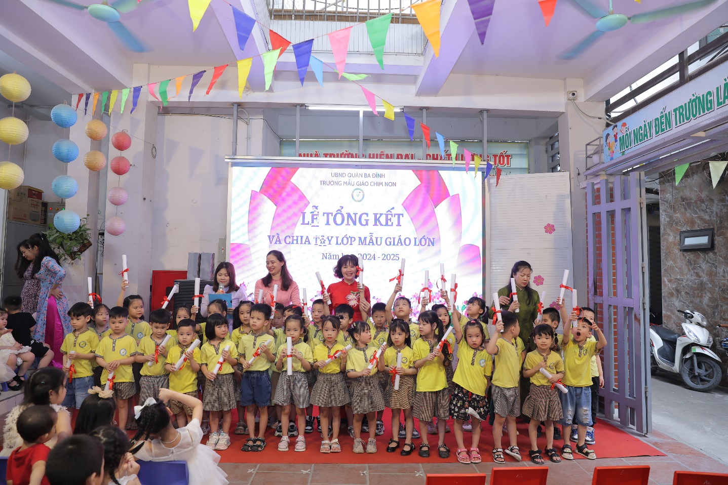 Cũng tại Lễ Bế giảng năm học 2024-2025, nhà trường tổ chức Lễ chia tay các con học sinh khối Mẫu giáo lớn để các con chuẩn bị bước sang cấp học mới- cấp tiểu học. Đại diện BGH - cô giáo Nguyễn Thị Thanh Huyền, Phó Bí thư chi bộ, Phó Hiệu trưởng nhà trường đã trao tặng giấy chứng nhận tốt nghiệp mầm non cho các con. Trong giây phút xúc động đó, các cô thật tự hào khi nhìn thấy các con học sinh của mình đã lớn khôn nhưng cũng thật buồn vì chỉ ít ngày nữa thôi, các con đã xa mái trường Chim Non thân yêu với biết bao kỉ niệm.