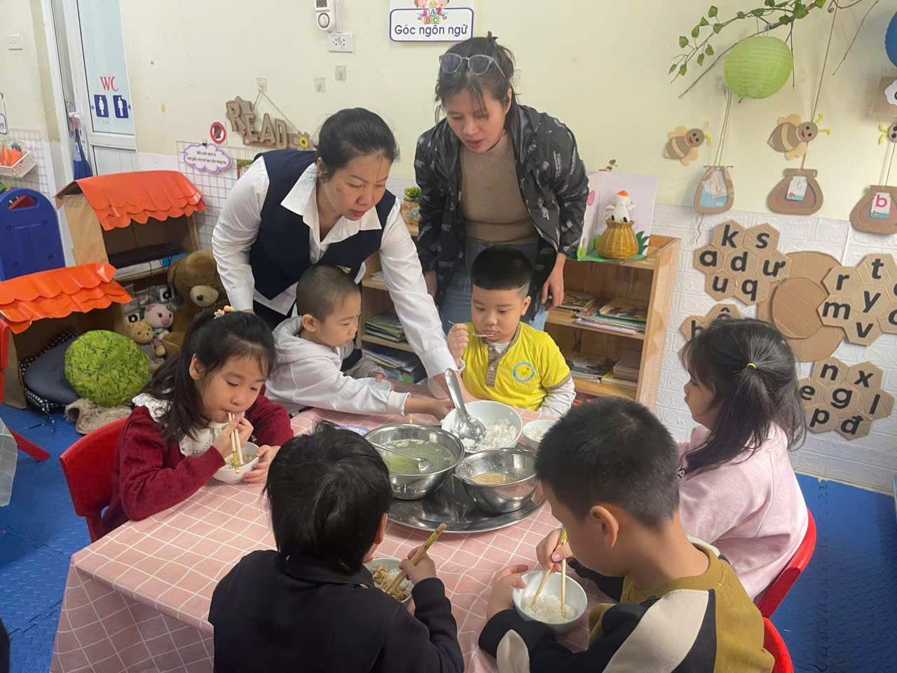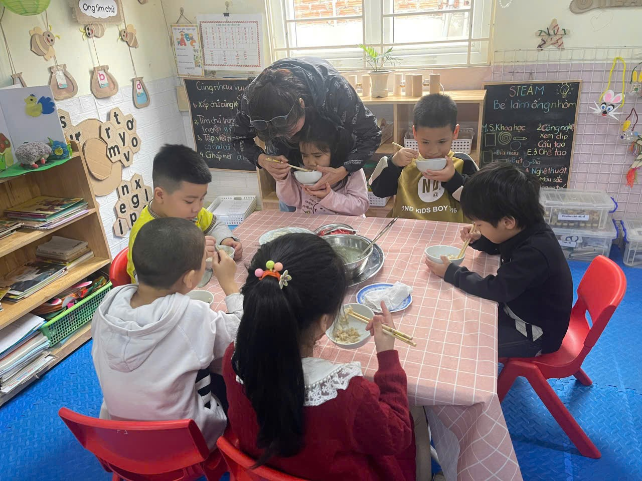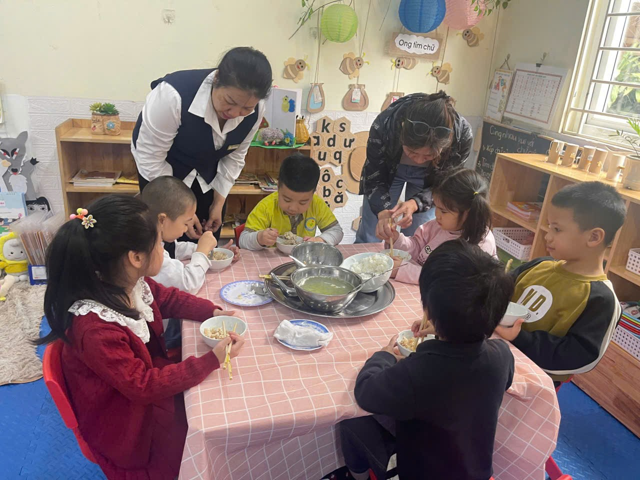 Hình thức “Bữa ăn gia đình” giúp các bé không chỉ ăn ngon miệng hơn mà còn học được kỹ năng sống quan trọng: từ cách lấy thức ăn vừa đủ, sự nhường nhịn, sẻ chia cho đến việc giữ gìn vệ sinh chung. Những ánh mắt háo hức, những câu chuyện thủ thỉ bên bàn ăn đã biến mỗi bữa cơm tại trường Chim Non trở thành một kỷ niệm đẹp, giúp các con phát triển toàn diện cả về thể chất lẫn tâm hồn, sẵn sàng hành trang vững chắc để bước vào lớp 1.