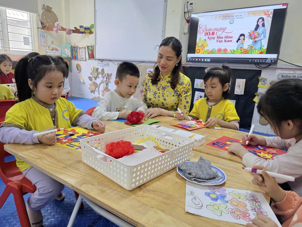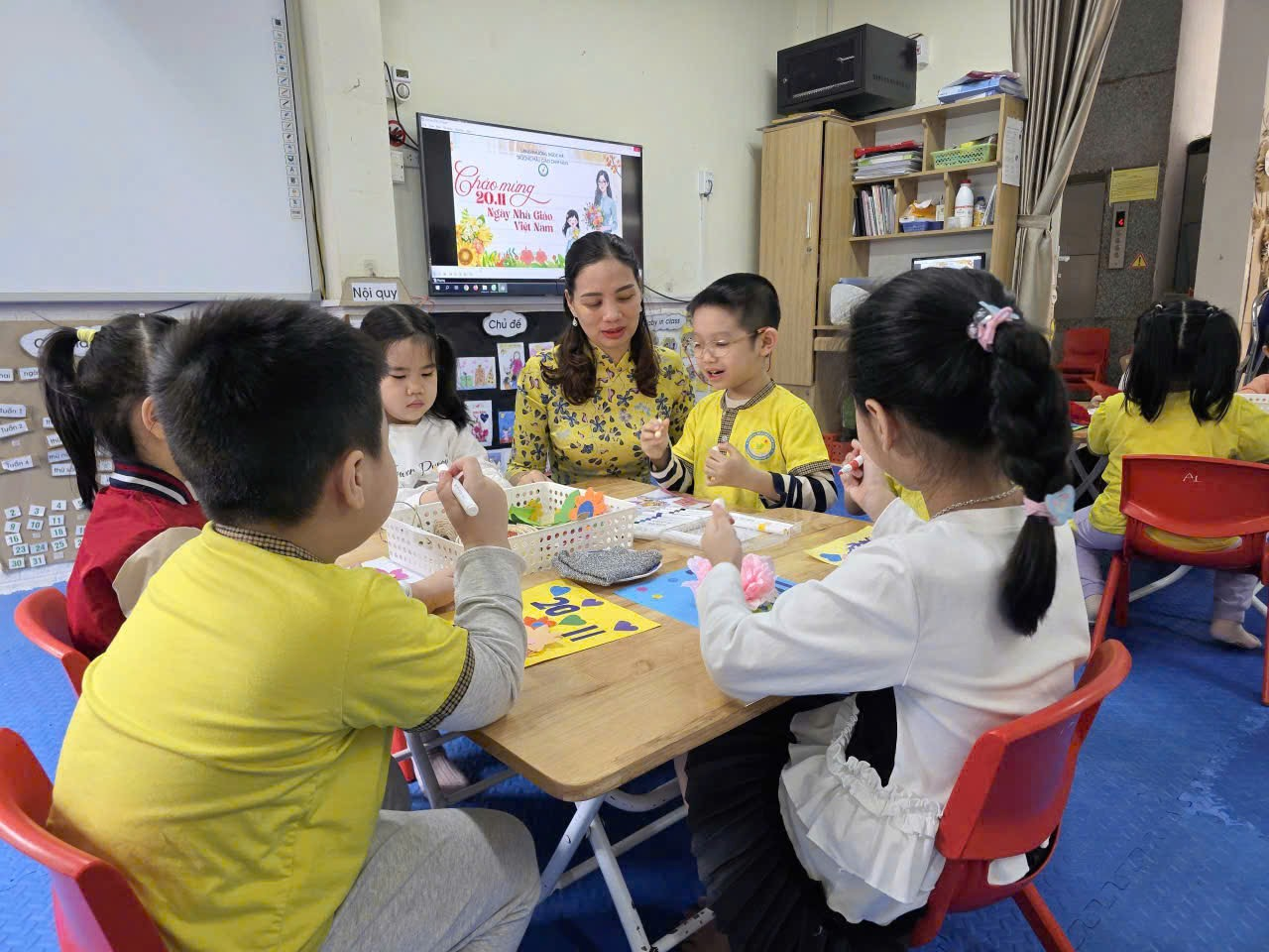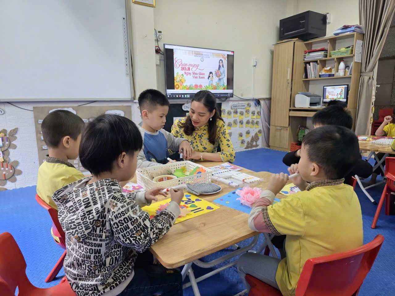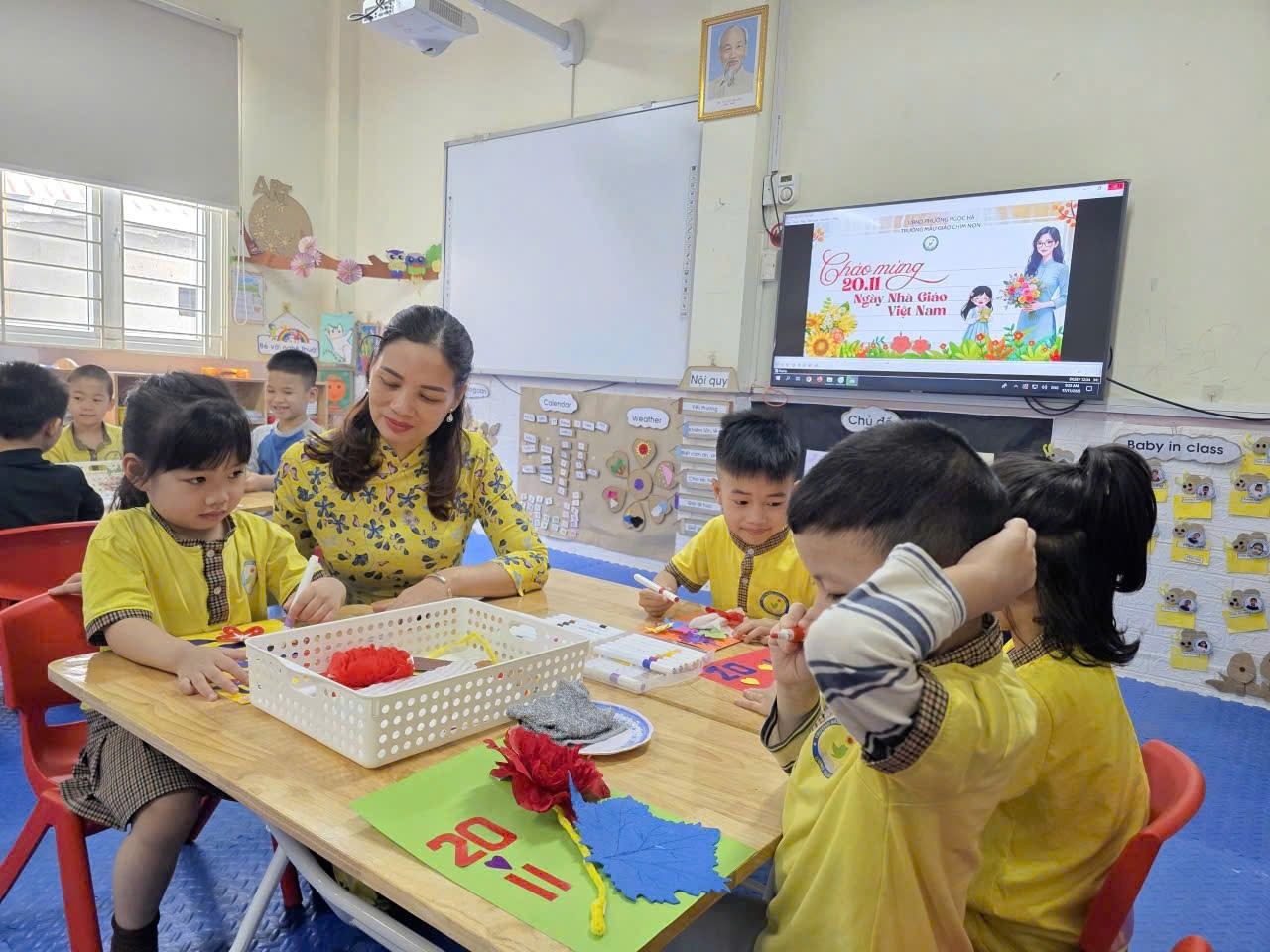 Sáng nay, lớp Mẫu giáo lớn A2 rộn ràng và ấm áp hơn mọi ngày, bởi các cô cậu học trò đang miệt mài với công việc làm thiệp chào mừng Ngày Nhà giáo Việt Nam 20/11. Những đôi tay bé xinh, thoăn thoắt cầm kéo, dán hồ, thể hiện sự khéo léo và tập trung đáng kinh ngạc. Góc học tập tràn ngập sắc màu rực rỡ của giấy thủ công, những ngôi sao lấp lánh và hình trái tim đỏ thắm. Bé Minh Thư tỉ mẩn dán hình hoa lên góc thiệp, còn bé Bảo lại cẩn thận dùng bút sáp vẽ hình cô giáo đang mỉm cười. Tuy nét vẽ còn vụng về, mảng dán chưa thật thẳng thớm, nhưng mỗi tấm thiệp đều chứa đựng biết bao tình cảm chân thành và lòng kính yêu vô bờ bến của các con gửi gắm đến các cô giáo. Đây không chỉ là một hoạt động thủ công, mà còn là bài học đầu tiên về sự biết ơn và cách thể hiện yêu thương của những "họa sĩ nhí" A2 dành cho người mẹ thứ hai của mình.