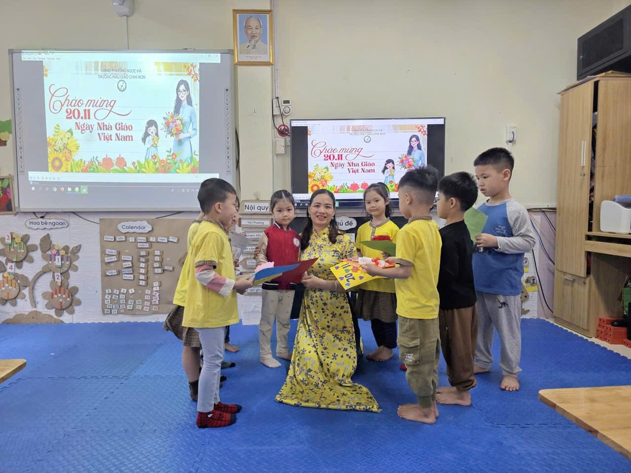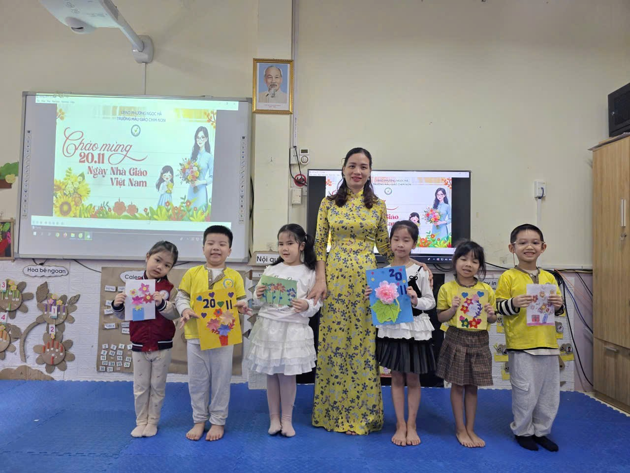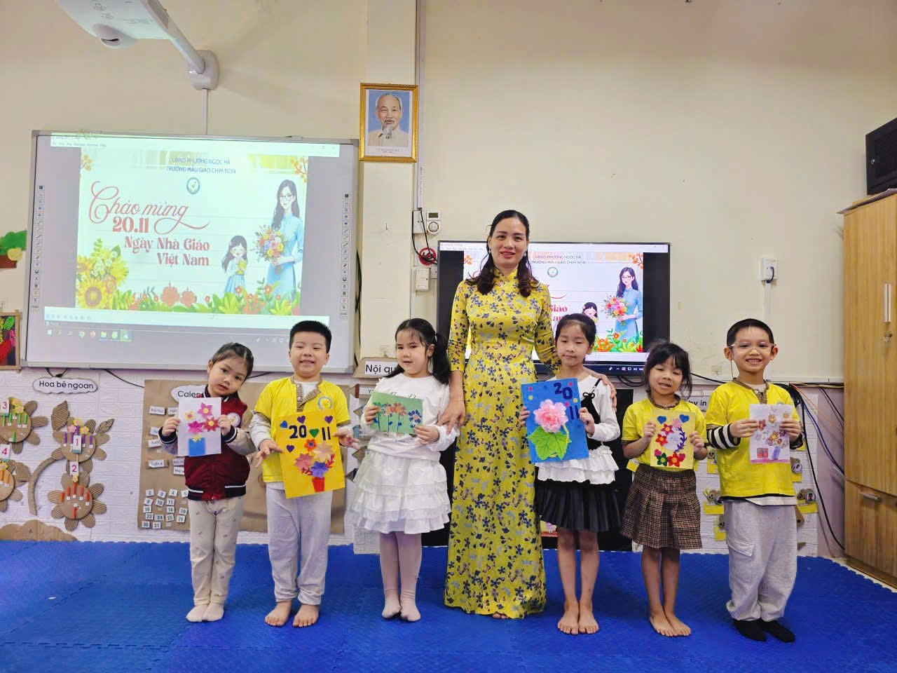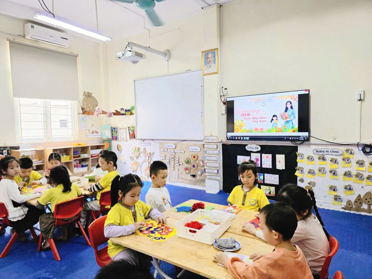 Sáng nay, lớp Mẫu giáo lớn A2 rộn ràng và ấm áp hơn mọi ngày, bởi các cô cậu học trò đang miệt mài với công việc làm thiệp chào mừng Ngày Nhà giáo Việt Nam 20/11. Những đôi tay bé xinh, thoăn thoắt cầm kéo, dán hồ, thể hiện sự khéo léo và tập trung đáng kinh ngạc. Góc học tập tràn ngập sắc màu rực rỡ của giấy thủ công, những ngôi sao lấp lánh và hình trái tim đỏ thắm. Bé Minh Thư tỉ mẩn dán hình hoa lên góc thiệp, còn bé Bảo lại cẩn thận dùng bút sáp vẽ hình cô giáo đang mỉm cười. Tuy nét vẽ còn vụng về, mảng dán chưa thật thẳng thớm, nhưng mỗi tấm thiệp đều chứa đựng biết bao tình cảm chân thành và lòng kính yêu vô bờ bến của các con gửi gắm đến các cô giáo. Đây không chỉ là một hoạt động thủ công, mà còn là bài học đầu tiên về sự biết ơn và cách thể hiện yêu thương của những "họa sĩ nhí" A2 dành cho người mẹ thứ hai của mình.