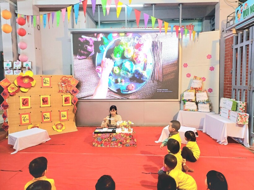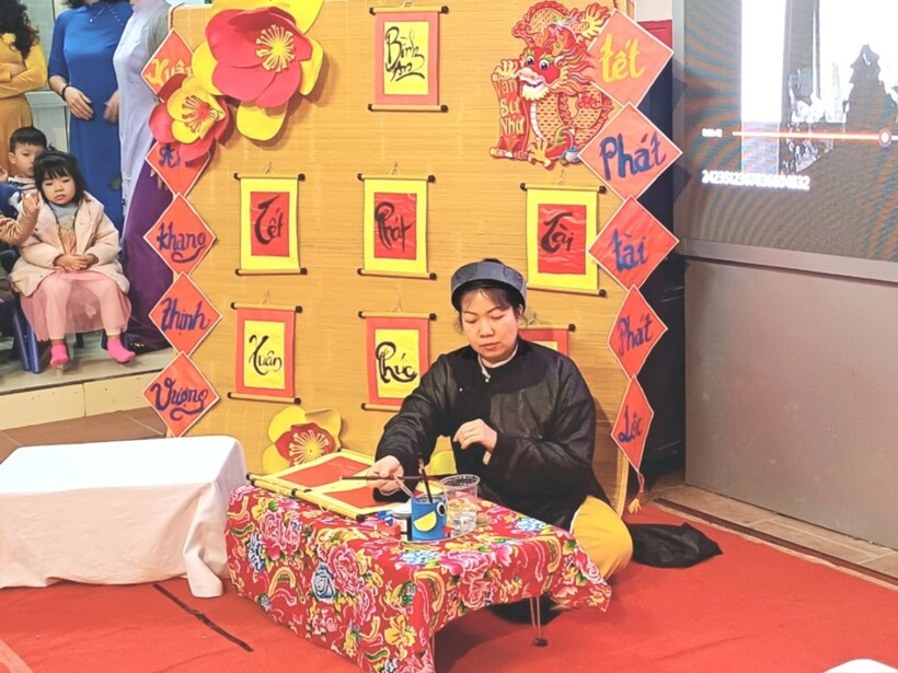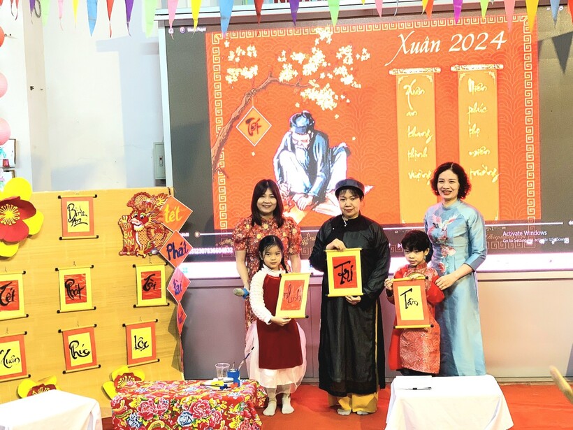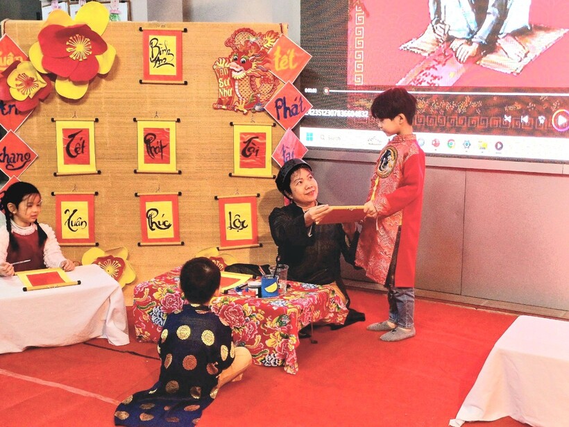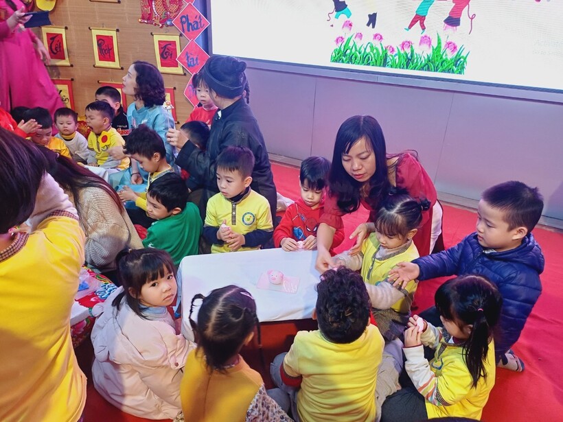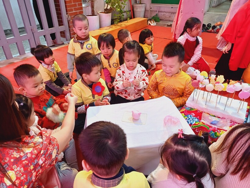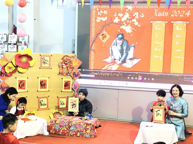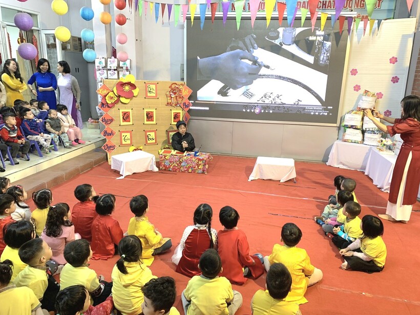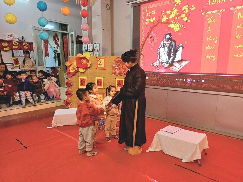Các bạn nhỏ trường Mẫu giáo Chim Non đã được trải nghiệm xem ông đồ viết câu đối, chữ thư pháp và dưới sự hướng dẫn của "ông đồ già" đã tự tay viết những chữ mình yêu thích trên giấy đỏ, đó là nét văn hóa xin chữ ông đồ đặc sắc mỗi dịp xuân về của dân tộc ta.