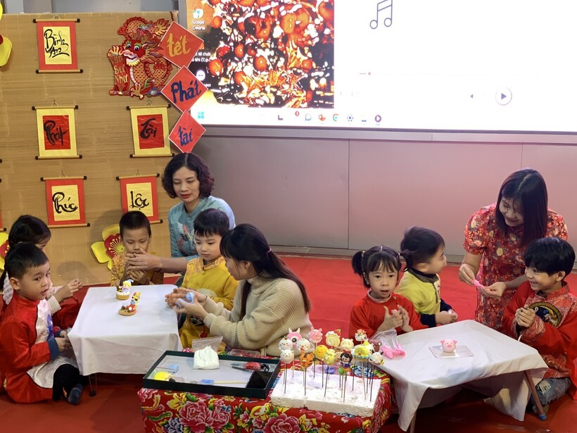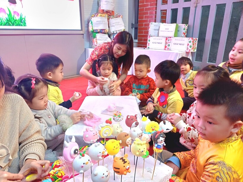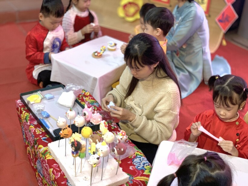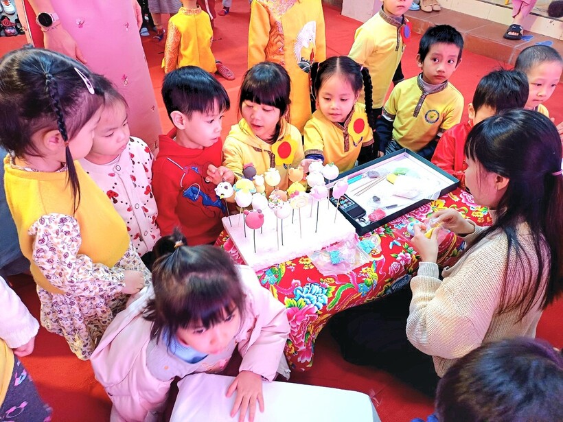 Nặn tò he cũng là hoạt động thú vị mà hầu hết các bạn nhỏ đều muốn tham gia trải nghiệm. Các bé được xem clip xuất xứ, các loại nguyên liệu và cách làm tò he truyền thống. Hiện nay có rất nhiều loại tò he hiện đại hơn, chất bột khác hơn, nhiều hình thú khác lạ hơn nhưng chúng vẫn mang đậm nét văn hóa nặn bột thủ công làm đồ chơi cho trẻ nhân dịp Tết đến. Các bạn nhỏ cũng được tham gia trải nghiệm vê đất, bóp đất, nhào trộn tạo màu, chia véo đất và nặn một số loại con vật đơn giản. trải nghiệm đơn giản mà rất bổ ích, lý thú đối với trẻ mầm non. Thông qua hoạt động này, các cô giáo không chỉ gợi nhắc cho trẻ một nét văn hóa dân tộc mà còn rèn kỹ năng khéo léo của đôi bàn tay, phát triển tố chất thẩm mỹ cho trẻ, rèn tính cần thận, kiên trì khi tập nặn những chi tiết bé xíu tinh xảo.