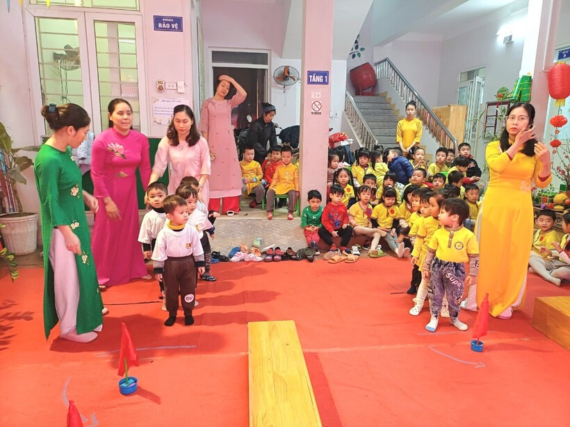 Các em bé lớp nhà trẻ cùng thi nhau đi chạy theo đường vòng cung, dích dắc, đi trên cầu khỉ. 2 đội lớp Mẫu giáo bé C1 và C2 thì tham gia tranh tài với phần thi chuyền bóng và chèo thuyền trên cạn. Các bạn nhỏ vô cùng phấn khích với màn thi đấu gay cấn giữa 2 đội Mẫu giáo Nhỡ B1 và các anh chị lớp Mẫu giáo Lớn A1 qua các phần thi  Nhảy bao bố - Đi cà kheo- Cắp cua bỏ giỏ.