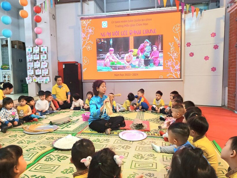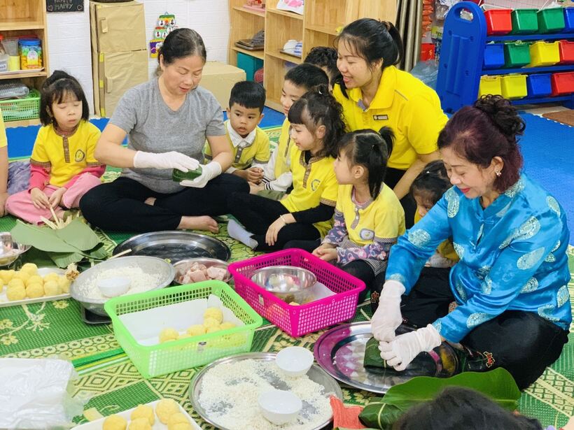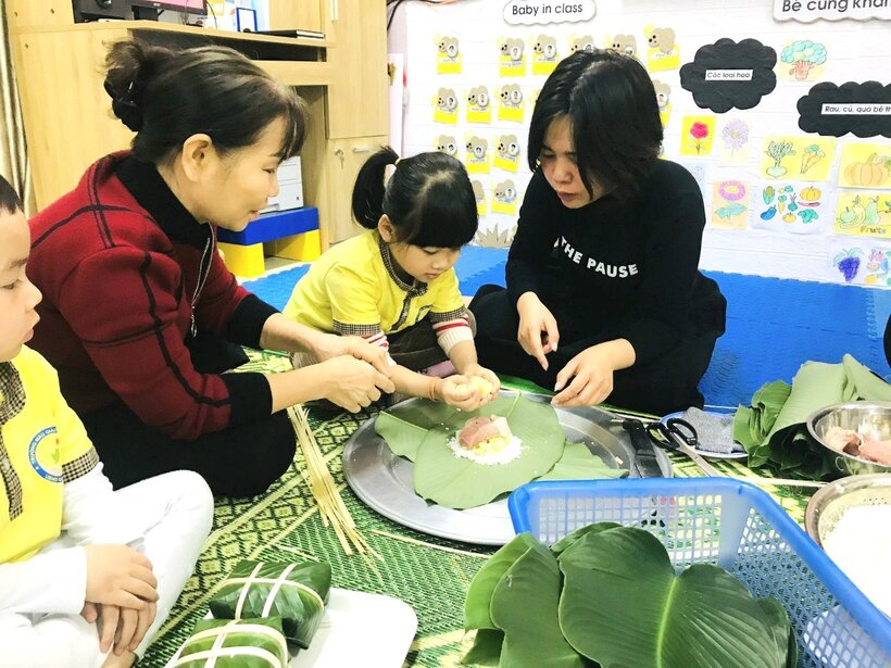 Đây là một trong những hoạt động rèn luyện kỹ năng cho trẻ được các cô giáo thường xuyên tổ chức.Trước khi bắt tay vào làm, các bé được cô giáo kể cho nghe câu chuyện “Sự tích bánh chưng” và giải thích cho các bé biết vì sao ngày Tết không thể thiếu bánh chưng. Bánh chưng tết hình vuông tượng trưng cho mặt đất hình vuông, bánh dày hình tròn tượng trưng cho mặt trời. Dân tộc Việt Nam ta trước đây lại là văn hóa lúa nước phụ thuộc vào yếu tố thiên nhiên rất nhiều. Chính vì vậy bánh chưng tết đã xuất hiện ở mâm cỗ ngày tết từ rất lâu, để thể hiện sự biết ơn trời đất đã cho mưa thuận gió hòa để mùa màng bội thu đem lại cuộc sống ấm no cho con người.