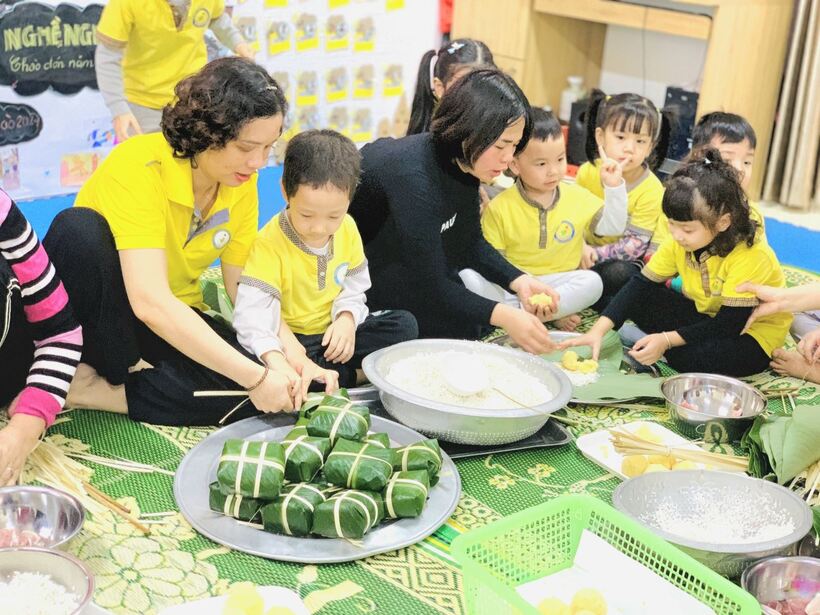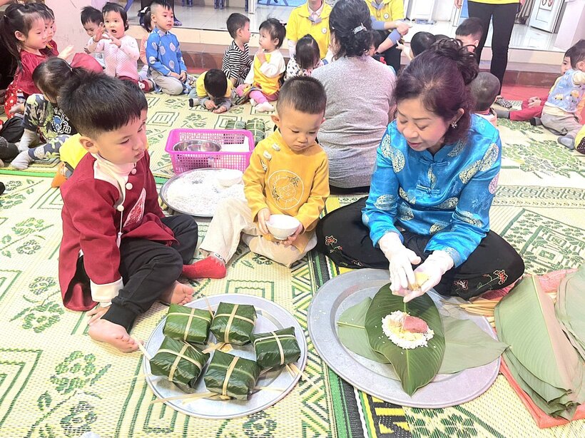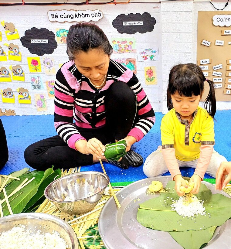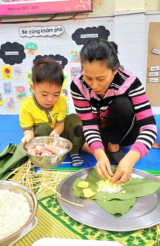 Các bé chăm chú quan sát hoạt động của bà, của cô và tự mình thực hiện từng bước gói bánh dưới sự hướng dẫn giúp đỡ của cô giáo, các bà, các mẹ. Bé nào cũng được tự tay mình đổ gạo, bóp đậu, buộc lạt, gập lá. Các con tỏ ra rất thích thú và hào hứng khi được học hỏi thêm về phong tục Tết cổ truyền của dân tộc, tự tay làm một món ăn truyền thống đặc trưng của ngày Tết..