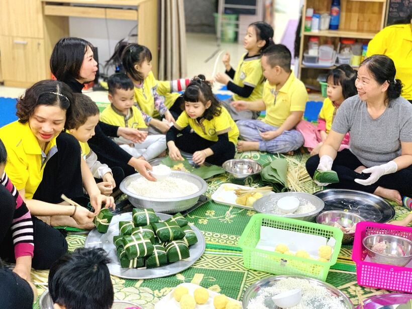 Sáng ngày 18/1, trường Mẫu giáo Chim Non tổ chức cho 100% trẻ thực hiện trải nghiệm hoạt động gói bánh chưng. Đây là một hoạt động ý nghĩa mà nhà trường thường tổ chức vào những ngày cận tết nhằm tạo cơ hội cho các bé được học hỏi, hiểu biết về phong tục tập quán tết cổ truyền dân tộc.