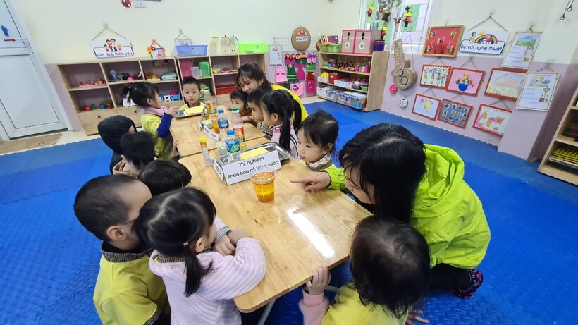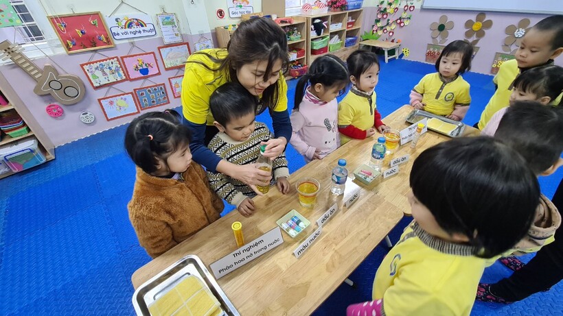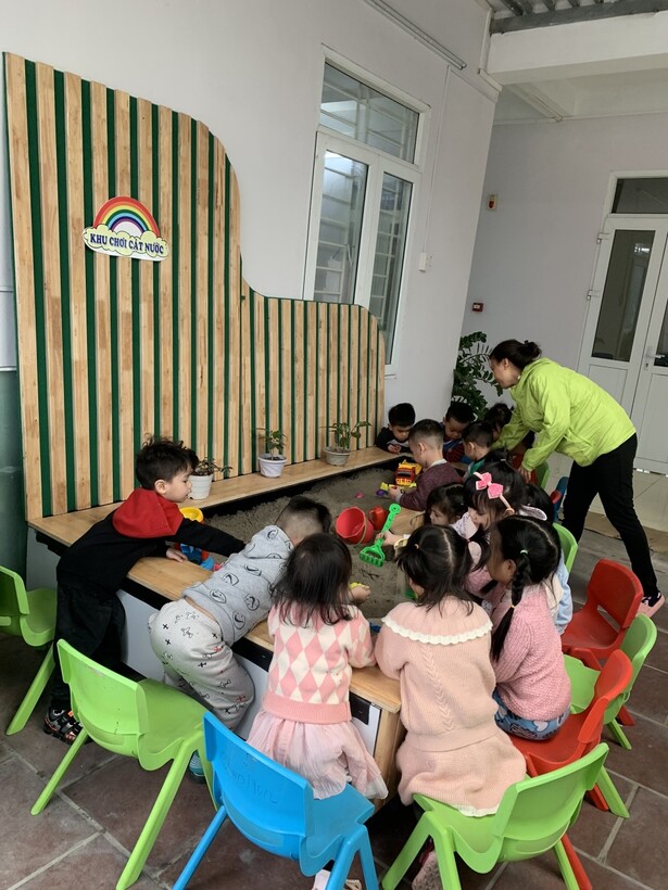 Các con được trải nghiệm qua các hoạt động học, hoạt động vui chơi, thực hành kỹ năng, thí nghiệm, hoạt động tự phục vụ...Cô trò tương tác tích cực làm trẻ tăng cường phát triển ngôn ngữ, phát triển kỹ năng tư duy, thể chất, thẩm mỹ...theo hướng toàn diện.