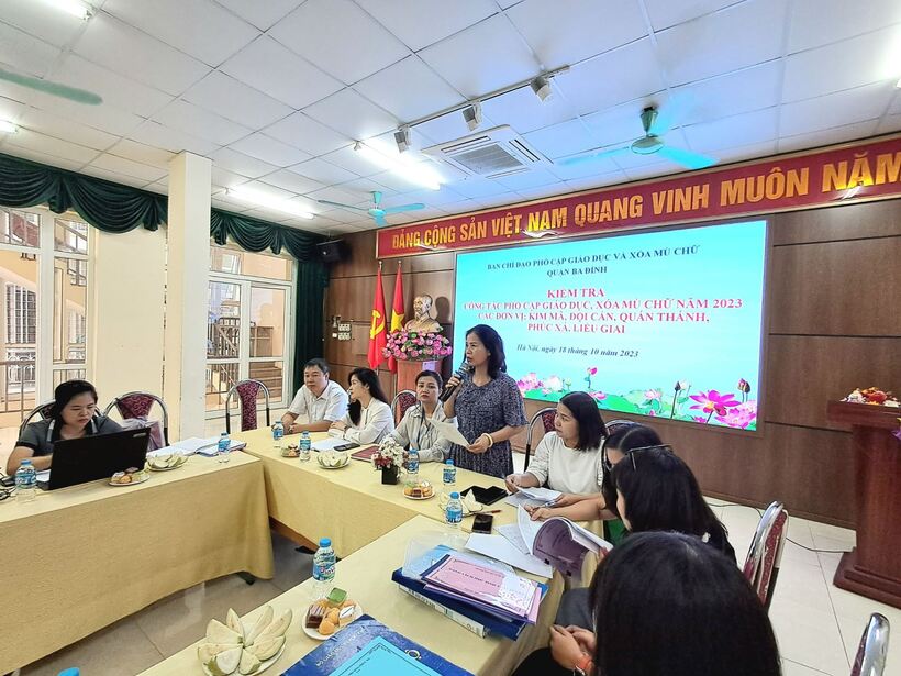 Sáng ngày 18/10, Đoàn kiểm tra của Quận Ba Đình do Đồng chí  Phạm Thị Ngọc Lan - Phó Trưởng phòng Giáo dục và Đào tạo làm Trưởng đoàn và các đồng chí thành viên đã có buổi kiểm tra công tác phổ cập giáo dục, xóa mù chữ năm 2023 của 5 phường: Kim Mã, Quán Thánh, Đội Cấn , Liễu giai, Phúc Xá tại Nhà sinh hoạt cộng đồng UBND phường Đội Cấn, quận Ba Đình.