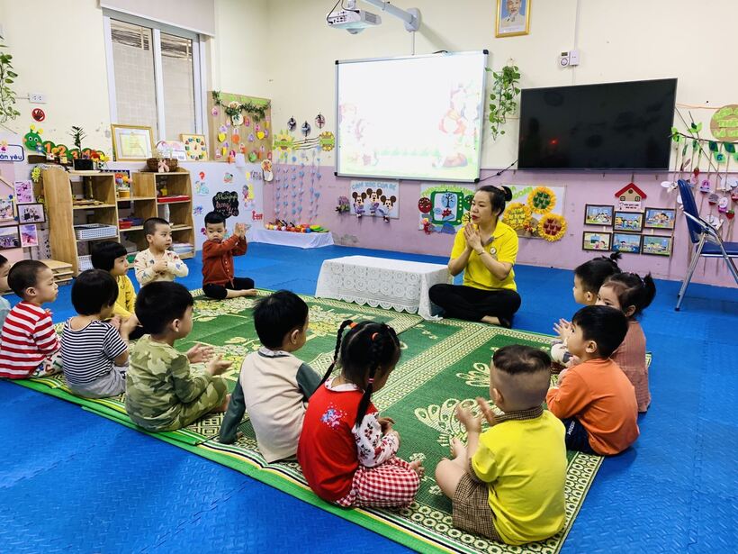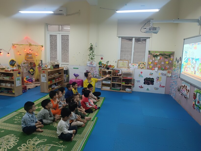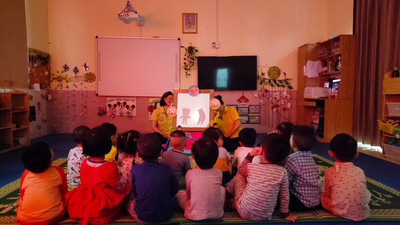 🔆Sau vở kịch, cô tận dụng ánh đèn và ánh mặt trời buổi sáng chiếu qua cửa sổ lớp học để hướng dẫn các bé cách tạo bóng trên tường và dưới nền nhà, lồng ghép những mẩu hội thoại sinh động như thể bé đang xem phim hoạt hình.