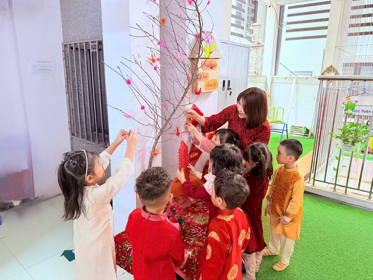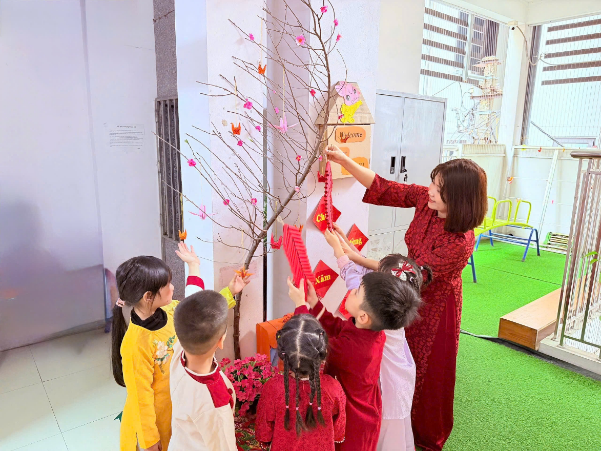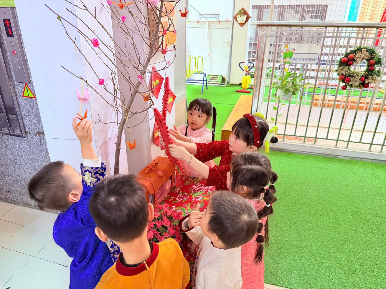 Trong những ngày đầu xuân, các con được cùng cô giáo tham gia các hoạt động thủ công như làm pháo giấy, gấp hạc, làm hoa đào để trang trí cành đào ngày Tết. Dưới sự hướng dẫn tận tình của cô, từng đôi bàn tay nhỏ nhắn, khéo léo nâng niu từng bông hoa, từng dải pháo đỏ, treo lên cành đào với niềm háo hức và say mê. Mỗi sản phẩm tuy còn giản dị nhưng chứa đựng rất nhiều niềm vui, sự cố gắng và sáng tạo của các con.