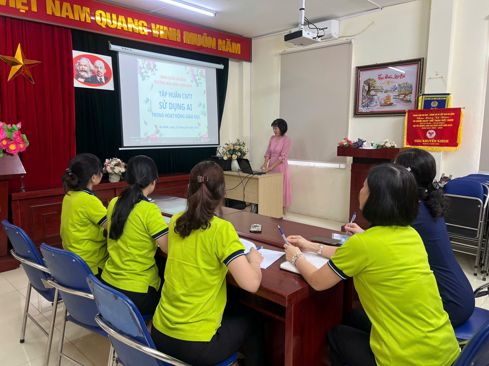 Hiểu được tầm quan trọng đó, trường Mẫu giáo Chim Non đã thường xuyên tổ chức các buổi tập huấn, bồi dưỡng CNTT cho đội ngũ giáo viên trong nhà trường nhằm giúp các giáo viên có cơ hội tiếp cận, tìm hiểu và sáng tạo trong giảng dạy. Buổi tập huấn lần này bồi dưỡng kỹ năng sử dụng AI trong hoạt động giáo dục,…