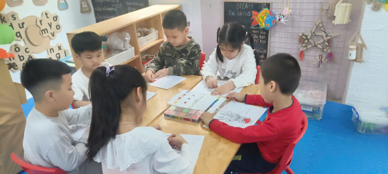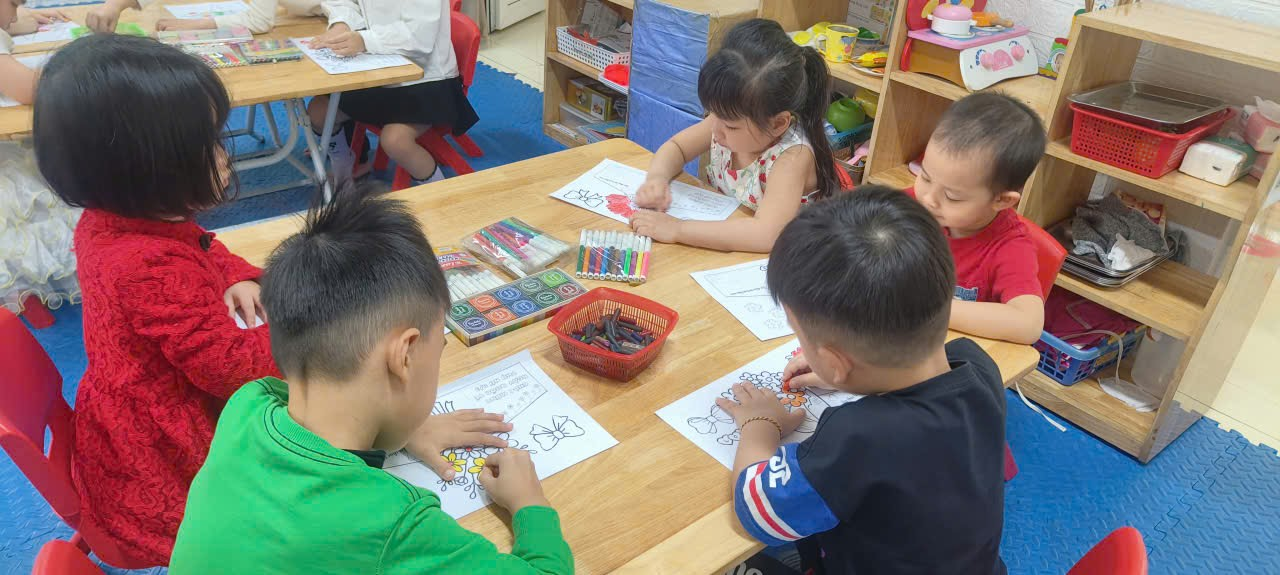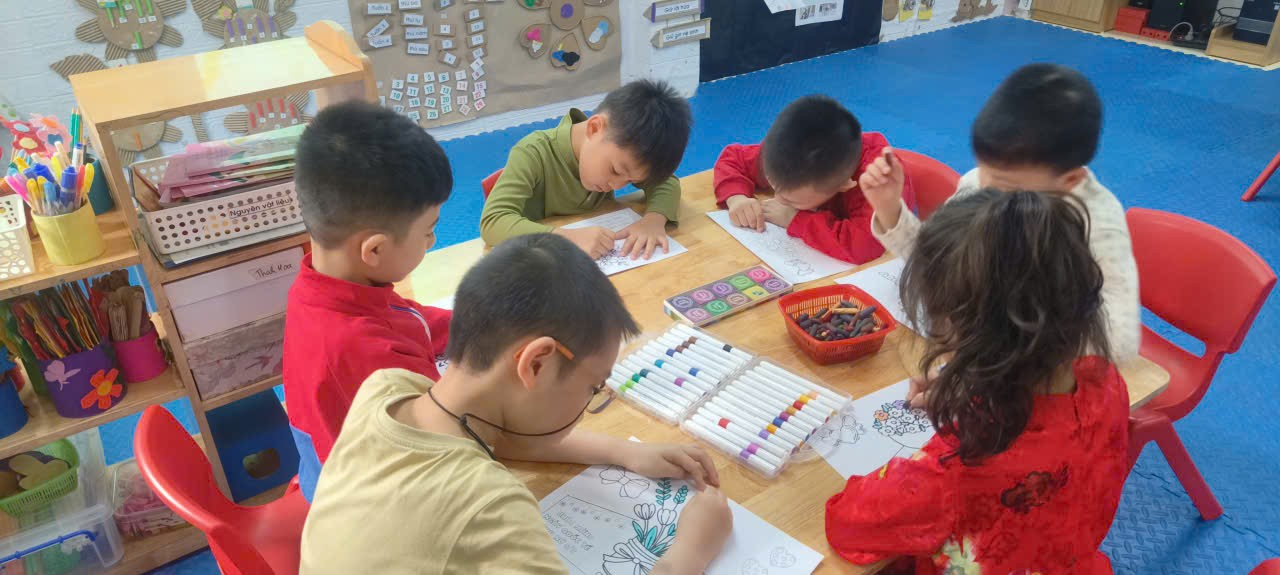 Tại các bàn học, không khí trở nên nhộn nhịp nhưng cũng đầy say mê. Các con tỉ mẩn cắt từng cánh hoa từ giấy màu, hoặc khéo léo cuộn những dải giấy dài để tạo thành những bông hoa nổi 3D sinh động. Có bạn lại chọn cách dùng vân tay chấm màu nước, tạo nên những nhành hoa độc đáo "có một không hai". Dưới sự hướng dẫn của cô, các bé lớp A2 bắt đầu học cách sắp xếp bố cục sao cho cân đối. Những chiếc nơ xinh, những hạt kim sa lấp lánh được các con đính lên như muốn gửi gắm tất cả sự trân trọng vào món quà nhỏ. Điều đặc biệt nhất ở lứa tuổi Mẫu giáo lớn chính là các con đã bắt đầu làm quen với chữ cái. Những dòng chữ như "CON YÊU MẸ", "CHÚC MỪNG 8/3" tuy còn nét thanh nét đậm, đôi khi còn hơi lệch dòng, nhưng đó là những dòng chữ chân thành nhất. Với những bé chưa thạo viết, các con có thể chọn những sticker lời chúc có sẵn để dán vào trang trọng bên trong tấm thiệp. Kết thúc giờ học, những tấm bưu thiếp rực rỡ sắc màu đã hoàn thiện. Mỗi tấm thiệp là một vẻ, không ai giống ai