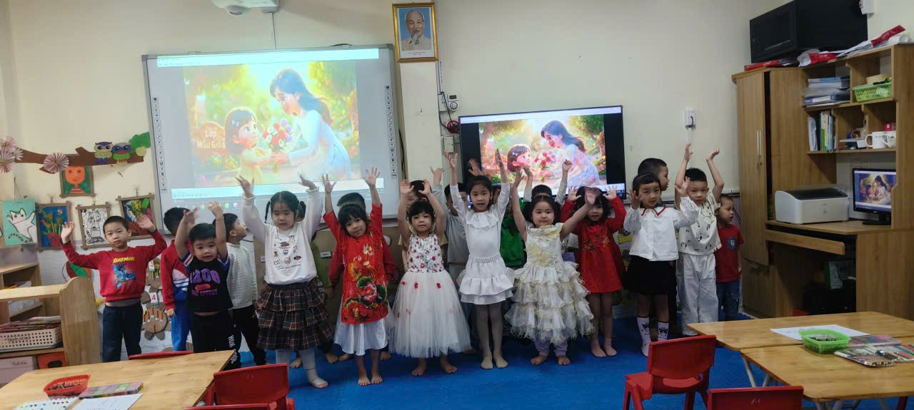 Mở đầu tiết học, cô giáo cho cả lớp cùng hát bài "Quà mồng 8 tháng 3", sau đó sang phần "Con muốn tặng thiệp" chính là chất liệu tuyệt vời để bắt đầu buổi học.