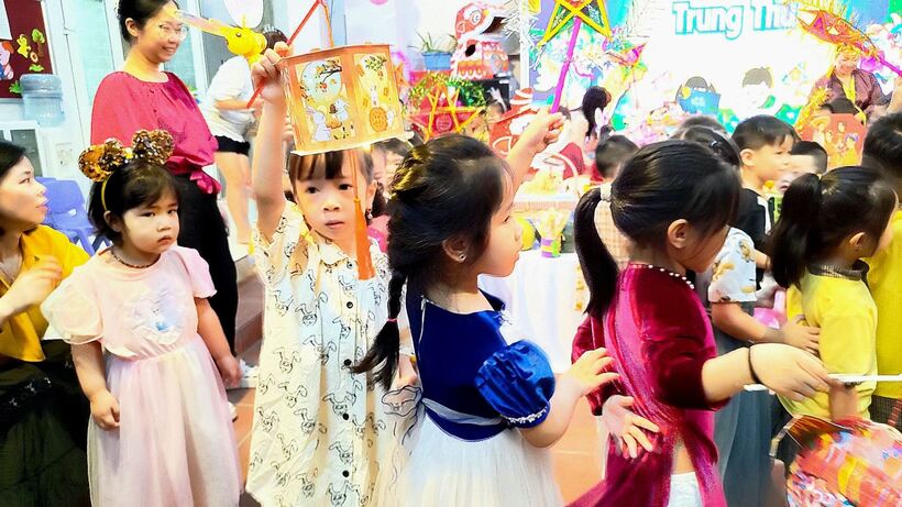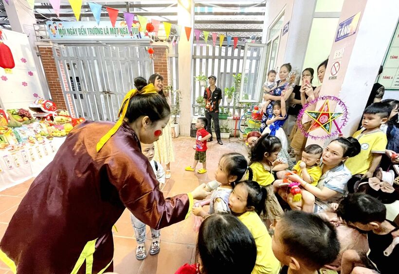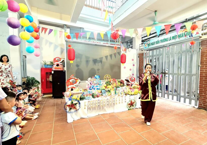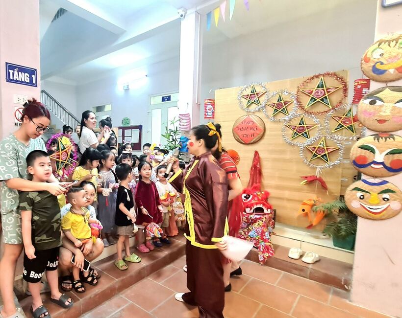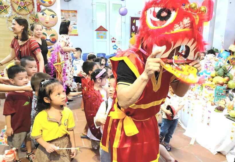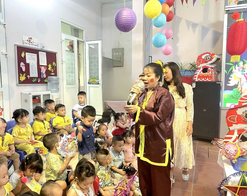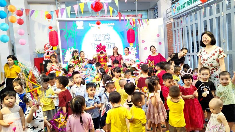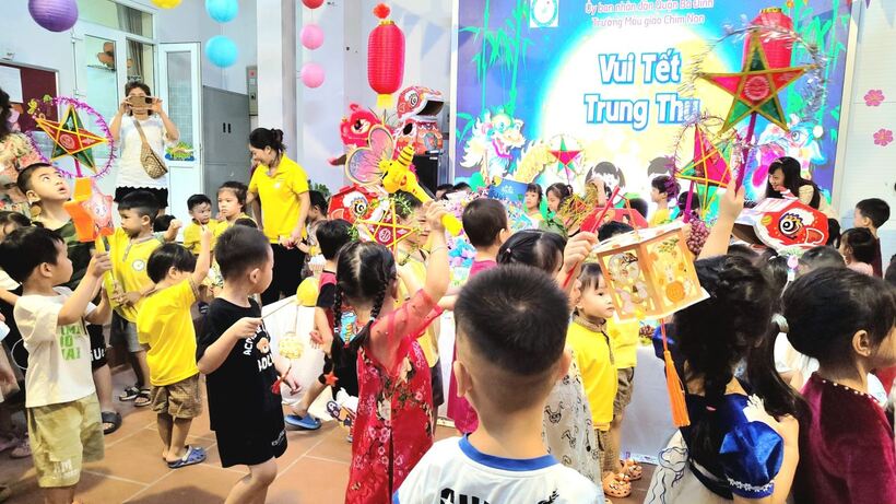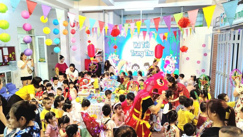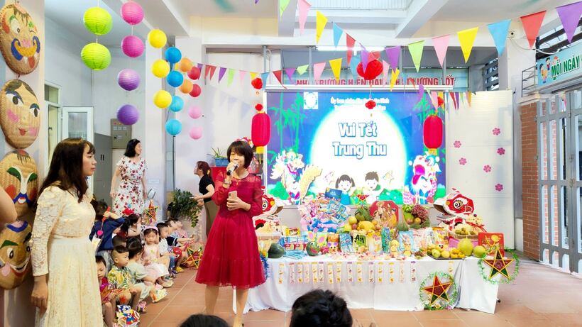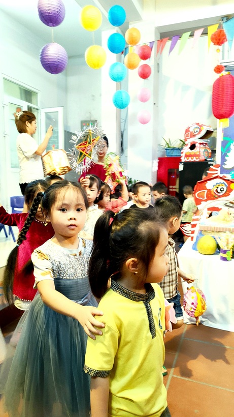 Ngay từ sáng sớm, các cô giáo, cô bác cấp dưỡng, nhân viên nhà trường, phụ huynh và các con học sinh đã háo hức tham gia công tác trang trí bày mâm cỗ Trung thu thật lớn giữa sân trường. Các bé yêu trên tay với lồng đèn, đầu sư tử, váy áo rực rỡ sẵn sàng tham dự màn rước đèn Trung thu của lớp mình.