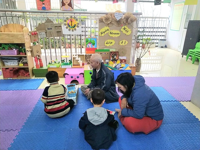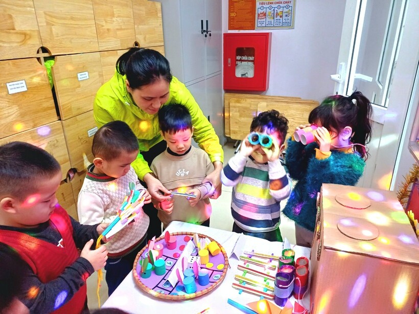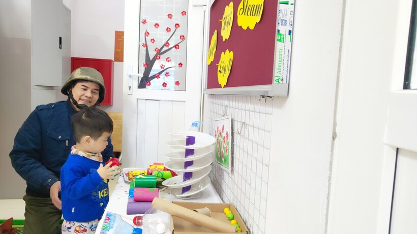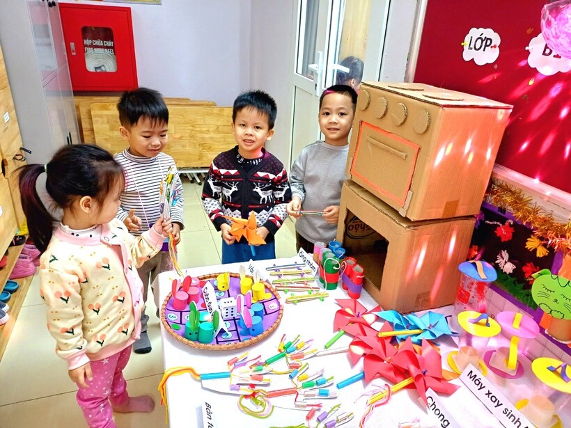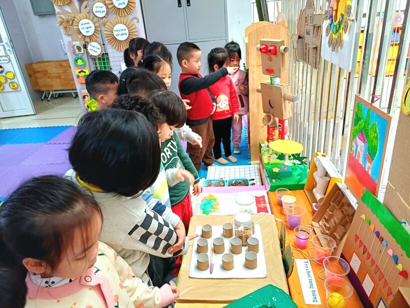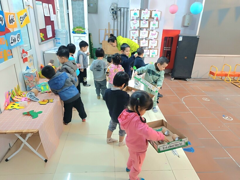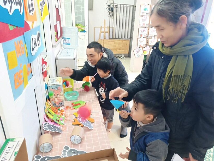 Tiếp theo là hoạt động trải nghiệm đồ dùng, đồ chơi của các lớp trong toàn trường. Hoạt động này kích thích sự tò mò, tính sáng tạo của trẻ. Trẻ ở các lớp vô cùng thích thú khi thấy từ những nguyên vật liệu dễ kiếm, dễ làm đều có thể tạo ra những đồ chơi hấp dẫn, độc đáo mà vô cùng đơn giản. Các bạn nhỏ hào hứng trải nghiệm và thật vui khi được làm điều này cùng ông bà bố mẹ và những người thân.