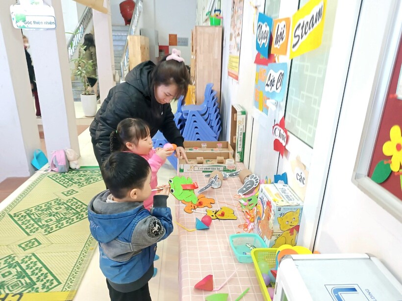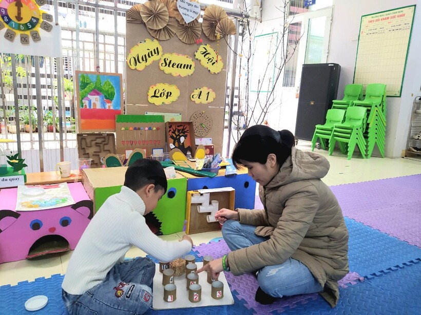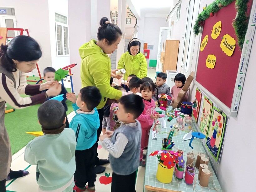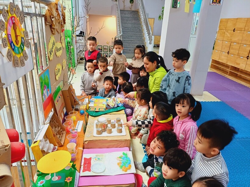 Ngày từ đầu giờ sáng, các lớp học đã nhộn nhịp hẳn lên với sự chuẩn bị chu đáo của cả cô và trò để tạo nên những khu trưng bày độc đáo , thú vị với những đồ dùng đồ chơi STEAM do chính tay các bạn nhỏ tạo ra dưới sự hướng dẫn của cô giáo.