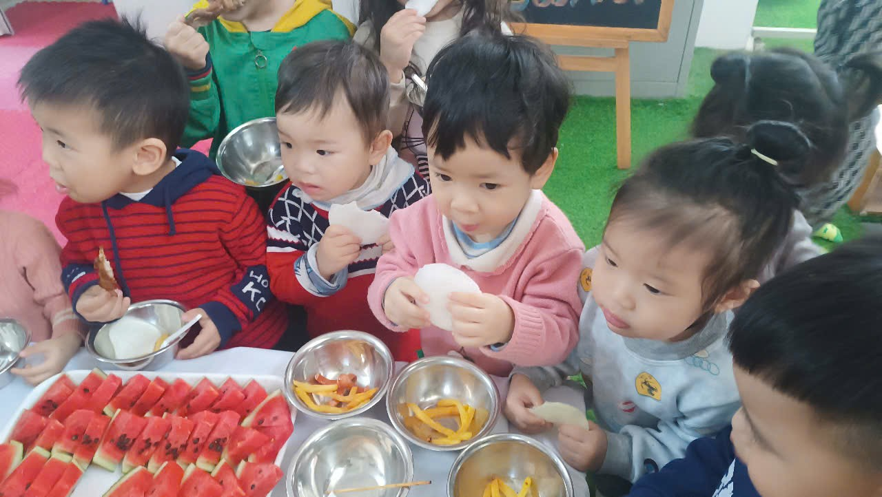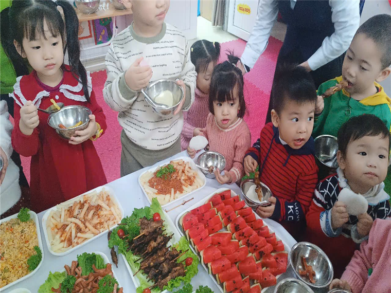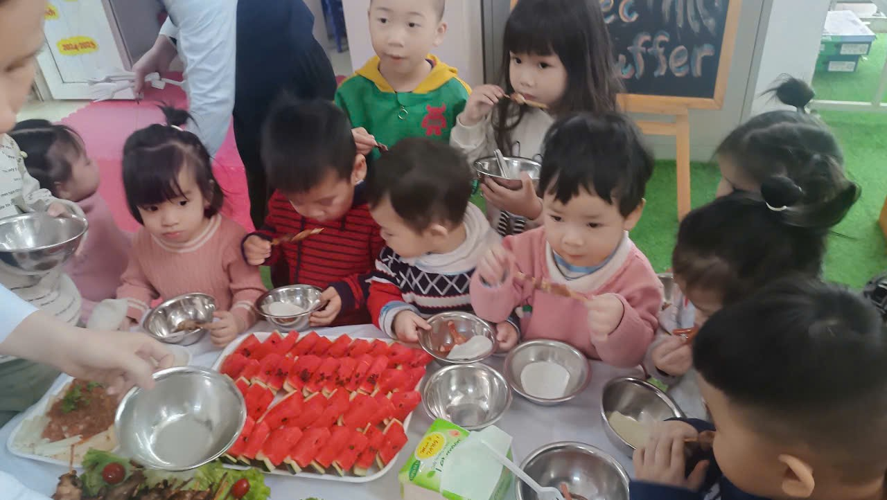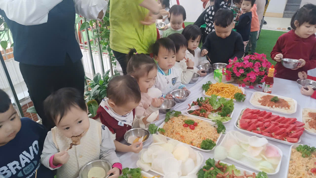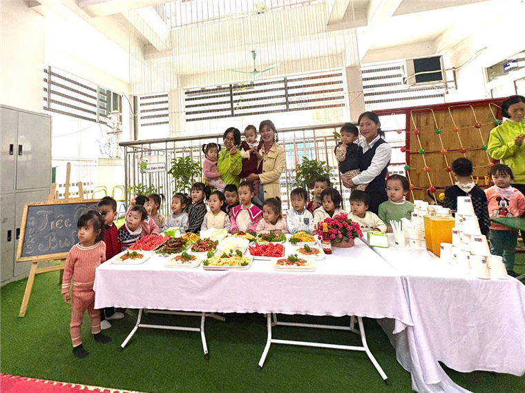 Đây không những là dịp giúp bé có thể thưởng thức các món buffet cho trẻ em ngon – bổ dưỡng, mà nó còn dạy cho bé rất nhiều điều trong phép lịch sự khi ăn uống, kỹ năng sống hữu ích. Các bé lớp nhà trẻ D vô cùng hào hứng tham gia buổi tiệc.